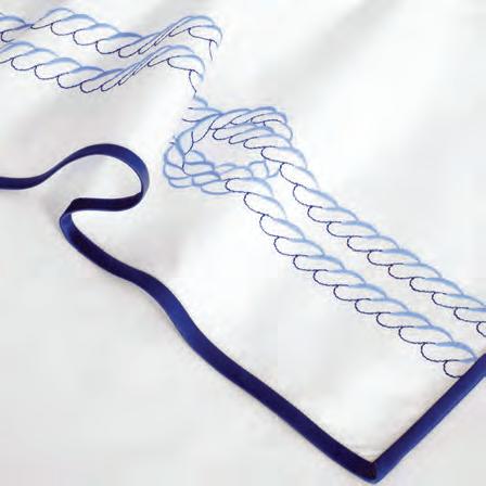 Percale, 100 % coton peigné longues fibres, 80 fils/cm². Finition double bourdons colorés. Duo coloris Marine présenté ci-dessus. 100% long staple combed cotton percale, 200 thread count. Double burdon stich finish. Duo in Marine color shown above.