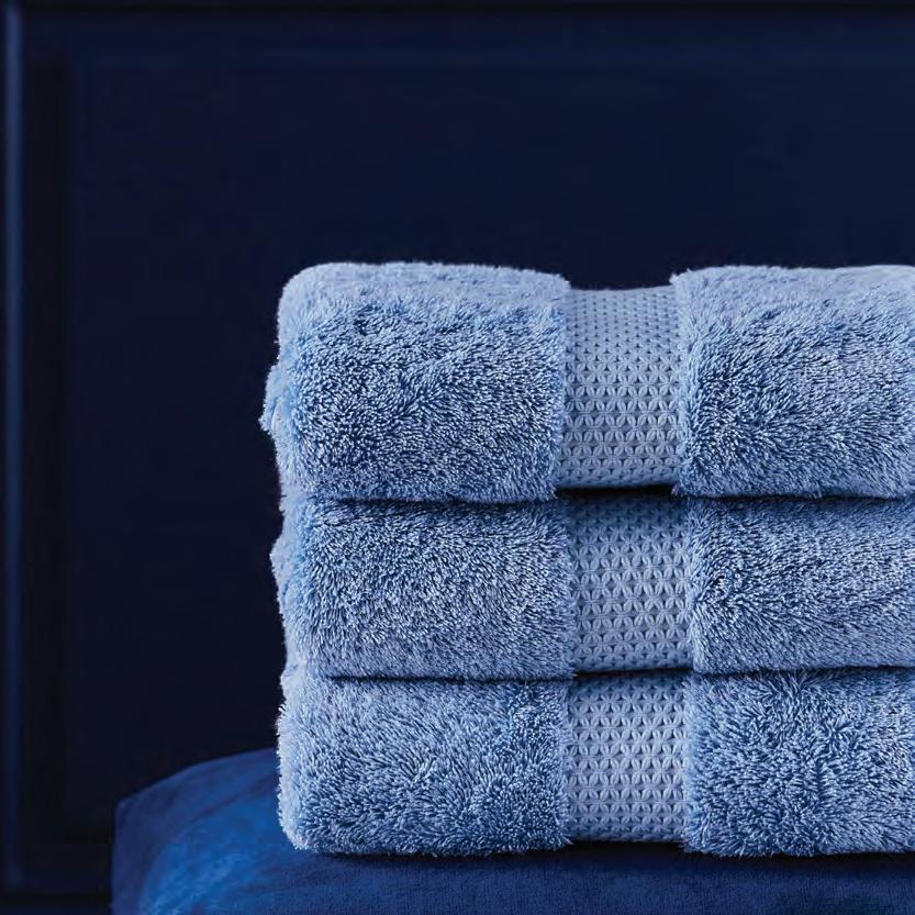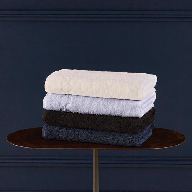 Éponge unie finition avec bourdon coloré sur éponge blanche et bourdon blanc sur éponge colorée. 100% coton, 550 g/m². À coordonner avec le tapis Adagio Embroidered terry. Colored bourdon finsih for solid white terry and white bourdon for colored solid terry. 100% cotton, 550g/m². To match with Adagio Bath Mat.