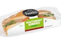 Ainesosat: Moniviljapatonki 50 % (vehnäjauho, vesi, siemensekoitus (maissihiutale, pellavansiemen, soija, auringonkukansiemen, hirssi, ohramallas, vehnägluteeni, vehnäjauho, sokeri, emulgointiaine (E472e), vehnämallas, entsyymit, jauhonparanne (E300)), sokeri, rapsiöljy, hiiva, mallasjauho (ohra vehnä), vehnägluteeni, glukoosi, suola, vehnähapantaikina), southwest-kastike 28 % (rapsiöljy, vesi, sinappi (vesi, sokeri, sinapinsiemen, etikka, suola, rypsiöljy, väri (E150a), säilöntäaine (E211), valkopippuri), limetäysmehutiiviste (sis. sulfiittia), punaviinietikka, valkoviinietikka, kananmunankeltuainen, sokeri, korianteritahna (korianteri, vesi, auringonkukkaöljy, suola, sokeri, happamuudensäätöaine (E260)), suola, paprika, savustettu paprika, chili, persilja, valkosipuli, juustokumina, hapettumisenestoaine (E220), sakeuttamisaineet (E412, E415), säilöntäaineet (E202, E211)), palvikinkku 16 % (kinkku (Suomi), vesi, suola, stabilointiaineet (E450, E451), hapettumisenestoaine (E301), säilöntäaine (E250 natriumnitriitti)), jääsalaatti. Saattaa sisältää pieniä määriä maitoa. Voimakassuolainen