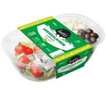 Ainesosat: Salaattisekoitus (jäävuori- ja romainesalaatti), kurkku, salaattijuusto 11 % (laktoositon pastöroitu maito, suola, juoksute, hapate), oliivi 9 %, paprika, punasipuli.