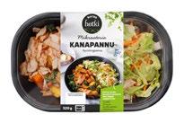 70146 Bistro Kanapannu 320 g Ainesosat: Kanapannu 78 %: Maustettu peruna (peruna, rapsiöljy, paprikajauhe, sitrus-currymausteseos (suola, sokeri, mausteet (mustapippuri, kurkuma, korianteri, persilja, juustokumina, sitruuna, paprika, sipuli, sarviapila), aromit, happamuudensäätöaine (E330), aromivahvenne (E621)), paahdettu juuressekoitus (porkkana, palsternakka, hunaja, suola, mustapippuri), gyrosmaustettu broileri 22 % (broilerin reisiliha (Suomi), vesi, suola, mausteet (paprika, mustapippuri, oregano, pimento), dekstroosi, stabilointiaineet (E450, E451), hiivauute), paprika, lehtikaali.