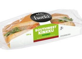 94545 Southwest Kinkkupatonki 160 g Ainesosat: Moniviljapatonki 50 % (VEHNÄJAUHO, vesi, siemensekoitus (maissihiutale, pellavansiemen, SOIJA, auringonkukansiemen, hirssi, OHRAMALLAS, VEHNÄGLUTEENI, VEHNÄJAUHO, sokeri, emulgointiaine (E472e), VEHNÄMALLAS, entsyymit, jauhonparanne (E300)), sokeri, rapsiöljy, hiiva, mallasjauho (OHRA, VEHNÄ), VEHNÄGLUTEENI, glukoosi, suola, VEHNÄHAPANTAIKINA), southwest-kastike 28 % (rapsiöljy, vesi, sinappi (vesi, sokeri, SINAPINSIEMEN, etikka, suola, rypsiöljy, väri (E150a), säilöntäaine (E211), valkopippuri), limetäysmehutiiviste (sis. SULFIITTIA), punaviinietikka, valkoviinietikka, KANANMUNANKELTUAINEN, sokeri, korianteritahna (korianteri, vesi, auringonkukkaöljy, suola, sokeri, happamuudensäätöaine (E260)), suola, paprika, savustettu paprika, chili, persilja, valkosipuli, juustokumina, hapettumisenestoaine (E220), sakeuttamisaineet (E412, E415), säilöntäaineet (E202, E211)), palvikinkku 16 % (kinkku (Suomi), vesi, suola, stabilointiaineet (E450, E451), hapettumisenestoaine (E301), säilöntäaine (E250 natriumnitriitti)), jääsalaatti. Saattaa sisältää pieniä määriä maitoa. Voimakassuolainen