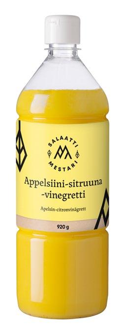Sitruuna-appelsiinivinaigrette 200 g: Rapsiöljy, vesi, valkoviinietikka (sis. sulfiittia), sokeri, sitruunatäysmehu (tiivisteestä), vaalea balsamietikka (sis. sulfiittia), appelsiinitäysmehutiiviste, väri (E160a), sitruuna-aromi, suola, limetäysmehutiiviste, appelsiiniaromi, sakeuttamisaine (E415), säilöntäaine (E202), valkopippuri. Pakattu suojakaasuun.