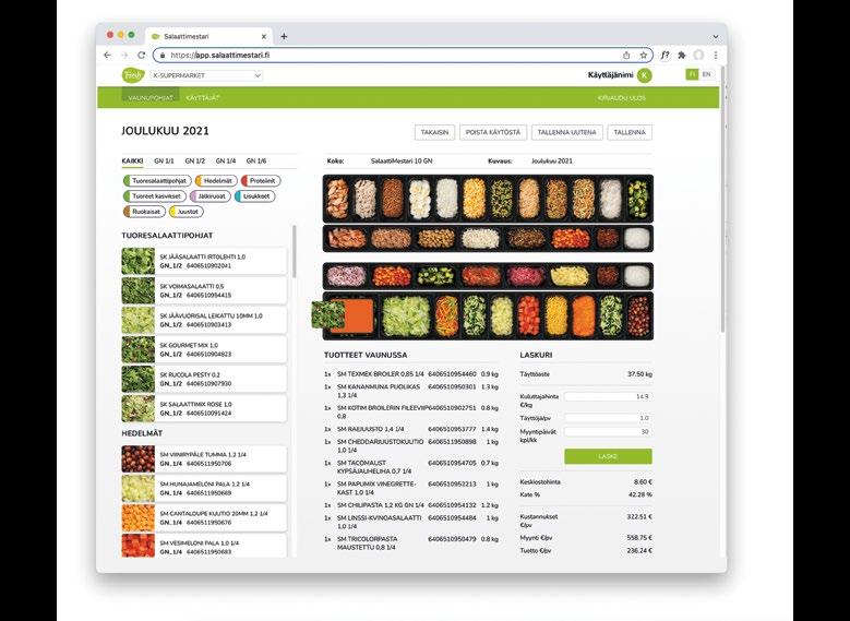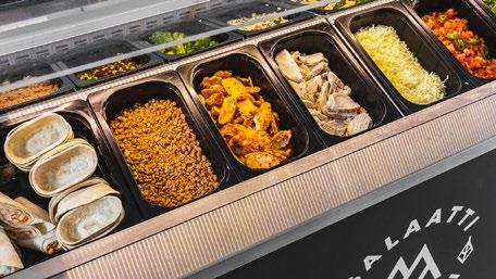 SALAATTIBAARITUOTTEET Tuoreet salaatit 10 Hedelmät . . . . . . . . . . . . . . . . 12 Proteiinit . . . . . . . . . . . . . . . . 13 Juustot 14 Ruokaisat komponentit 15 Lisukkeet 17 Kastikkeet & lisukepussit . . . . . . . . 18 SalaattiMestaritarvikkeet . . . . . . . . 19 PALVELUTISKITUOTTEET UUTUUDET! Syksy 2022 24 Syksyn kausituotteet 2022 25 Tuoresalaatit 28 Ateriatuotteet 30 Patonkiboksit 31 Jälkiruoat & makeat välipalat 32 Hedelmät 34 Palvelutiskitarvikkeet 35 2