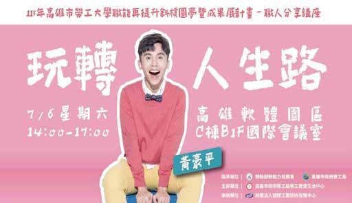 【記者/高培德報導】高市勞工局勞工教育生活中心7月6日下午2點在高雄軟體園 區B1國際會議室舉行113年勞工大學職能提升斜槓圓夢暨成果展計畫職人分享講座 ,邀請金鐘獎星光大道主持人黃豪平主講「玩轉人生路」,分享自身成長歷程、 投入演藝圈挑戰