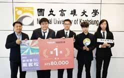 黑客松冠軍與8萬元獎金,校長陳啟仁(圖左一)嘉勉師生優 異表現。王重皓說,開發過程訪談銀髮族,深刻體會資訊落差程度,增強團隊運 用科技創造生活便利使命,曾仲平說,APP適用旅行社遊程、各縣市景點資訊查 詢等,作為推廣友善銀髮設施參考,體現公私協力精神。劉祐廷說,獲獎激勵士 氣,強化高齡數位平權議題認知。楊紹韋感謝教發、產學育成中心協助,還有主 辦單位提供展能機會。
