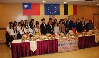 Olivier Dumoulin成果發表會介紹師生特製風味濃郁、口感獨特比利時鬆餅, 比國學生分組端出麵線糊、蔥油餅等美食飲品,發表台式餐食實作課程學習成 果,感恩歡送餐會中山工商餐飲科師生精心準備XO醬炒蝦仁鮮魷、檸檬風味蒸
