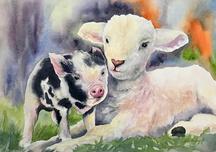 Thesetwobabyfarmanimalsloveeachothernomatter thedifferences.Myfocusonthispaintingwastohighlight theloveforeachotherandcompanionship.Iused strongerdetailsonthelambandpigletfaces.Painted contrastingcolorsonthepigletagainstthelambtobring outthefocalpoint,whicharetheirfaces.Thebackground waspaintedverylooselywithfuncolorstocompliment thebabyfarmbuddies.