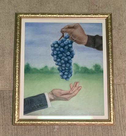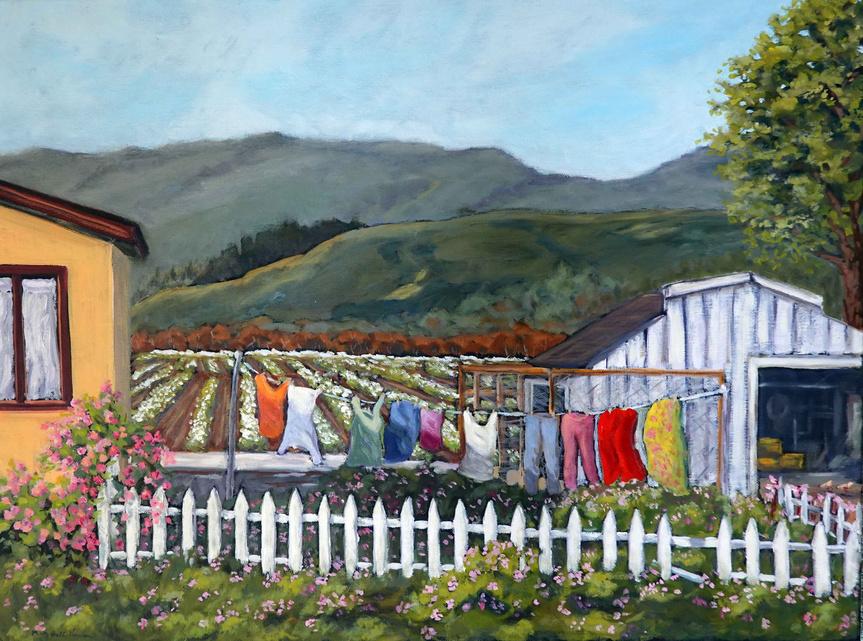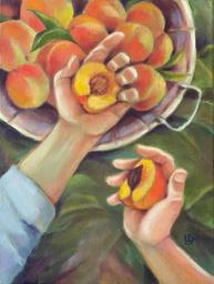 Thisoilpaintingshowsabasketofpeachesontheground below-andhandsaboveit,holdingthetwohalvesofa freshly-pickedpeach.Ididthisfrommyimaginationon beingthatluckyperson,justabouttobiteintoajuicy,ripe, just-pickedpeach.Weallknowthedifferenceinthetaste offarm-freshfruitandthosepickedgreenandshippedin bulk.Thispaintingcelebrateshowluckywearetolive amongstsomanyfarm-freshfruitsandvegetablesinour CentralValley.