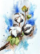InthispaintingIusedearthycolorsfortheouterpetalsof thecottonflowers.Delicatedetailstobringoutthe softnessandfluffycottonbolls.Ikeptthebackgroundvery looseandfunwithskybluecolorsthatplaybeautifully withtheearthytonesoftheplant.Myfamilyhasbeenin thecottonbusinessformanyyears.Wehaveprovided cottonginnersequipmentpartsforcottonginning machinery.Myfather-in-lawwasacottonginengineer andmyhusbanddidallthemarketingpartofthe business.GrowingupintheCentralValleyasyoudriveto thecoastorothercommunitiesyouwillprobablypassby cottonfields.Eachfalltheplantswillstarttodefoliateso cottonfarmerscanbegintheharvestofcotton.