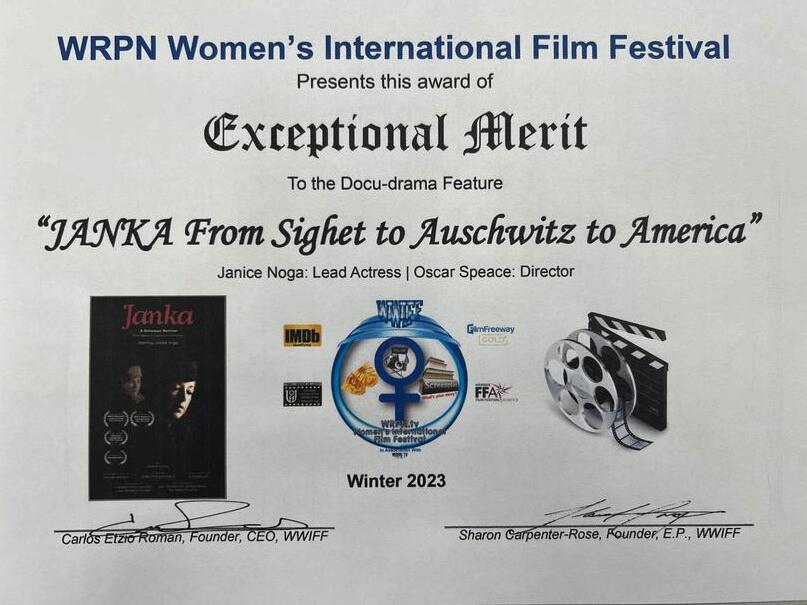 Janka, a fiscal project of the Fresno Arts Council, was presented an Exceptional Merit award by the WRPN Women’s International Film Festival for Winter, 2023. The film, JANKA From Sighet to Auschwitz to America, received “Exceptional Merit” in the Docu-drama Feature category for director Oscar Speace and “Merit, ” in the Actress, Lead subcategory for Janice Noga’s performance Learn more about the awards here Congratulations to the Janka Project!