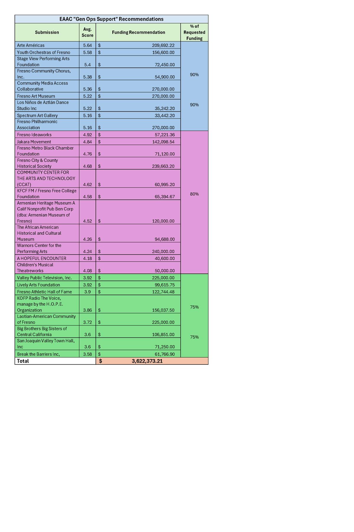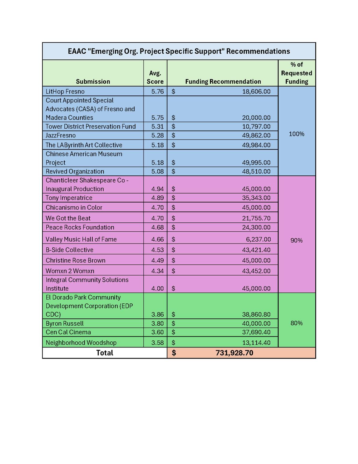 Since August 11, 2023, when the Cultural Plan was approved by City Council and Fresno Arts Council secured an administrative contract with the City to manage the application process, FAC completed the Cultural Plan, solicited community feedback to develop grant guidelines, distributed the resulting RFP through a robust outreach and engagement process, and provided application support and technical assistance in a variety of formats through the RFP deadline A diverse group of panelists, screened for conflicts, served as adjudicators for the EAAC’s competitive grant review process Now, many organizations and projects are poised to receive funding that will continue to enrich cultural arts in the City of Fresno