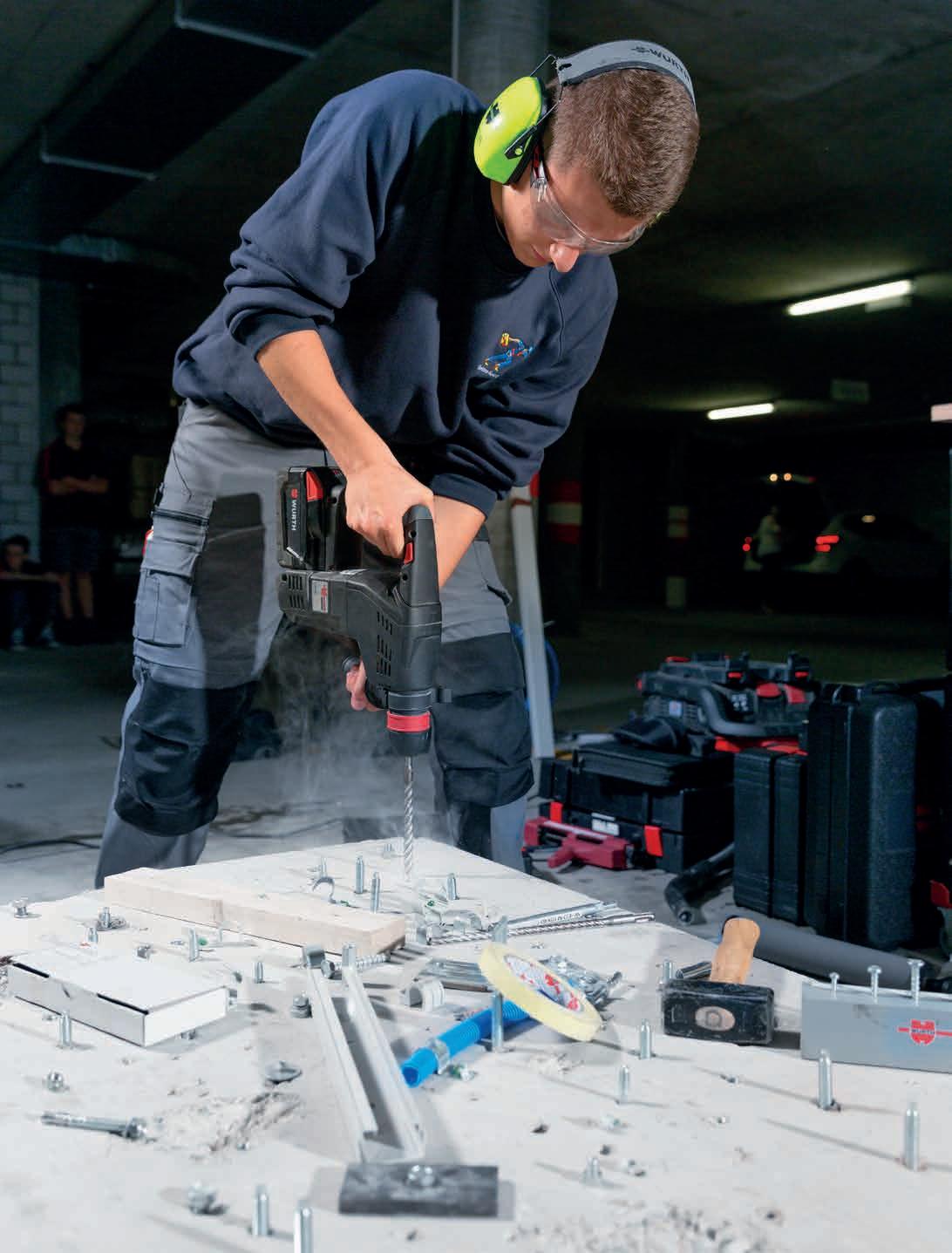 BEFESTIGUNGSTECHNIK. Natürlich gabs zuerst Theorie und Anschauungsunterricht. Die lauten Maschinen flössten trotzdem grossen Respekt ein. Da und dort sah man jedenfalls zitternde Hände beim ersten Mal. Einen Tag lang bohrten, klebten und dübelten die Lehrlinge in der Tiefgarage des EAZ mit Bolzenschiessapparat, Spitzmaschine und Schlagbohrhammer in einen Betonblock und in Backsteine – unter der Anleitung von Spezialisten der Firmen Würth und Hilti.