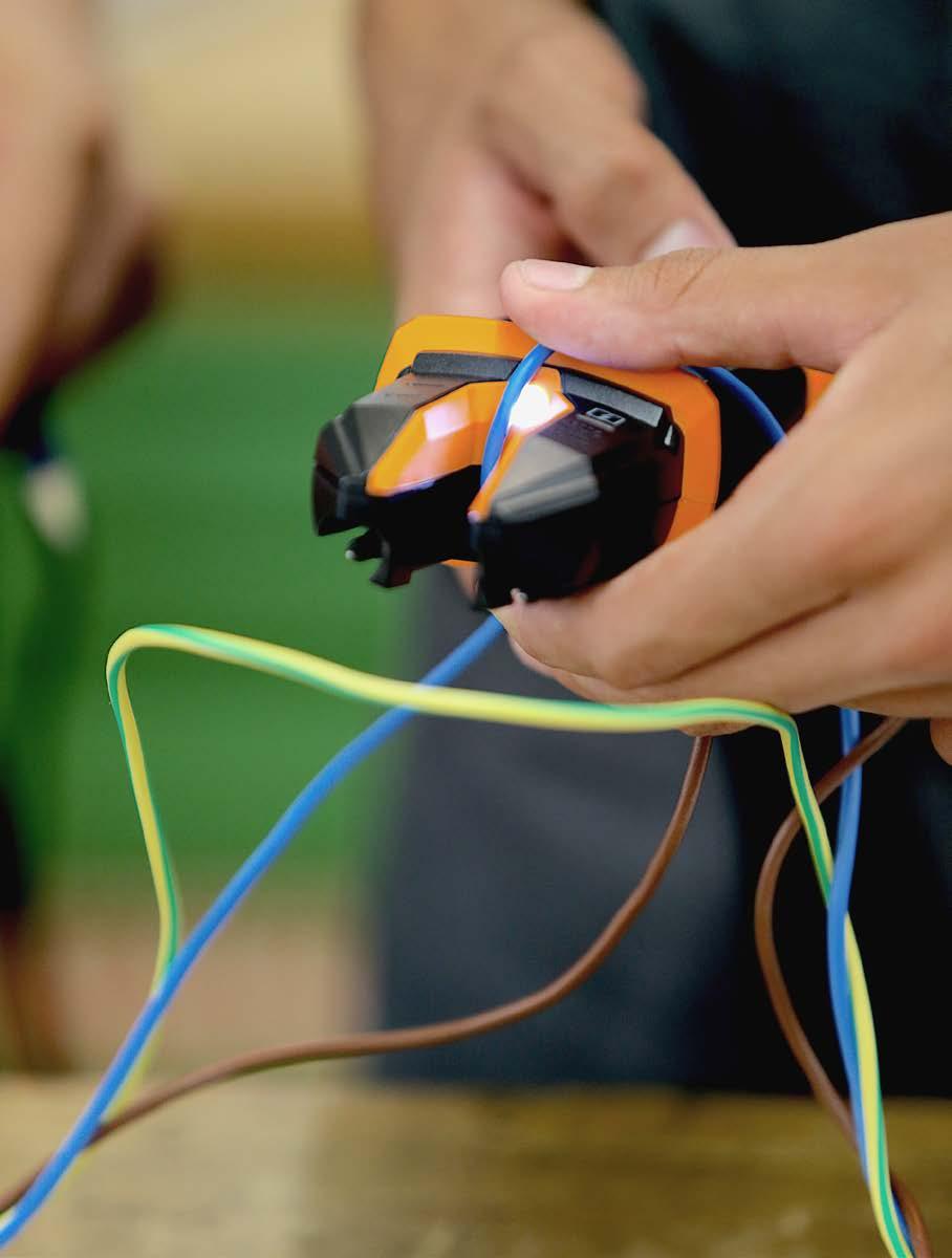 Am Anfang der Berufslehre werden Steine ins Rollen gebracht. Den 48 jungen Männern und 3 jungen Frauen erscheint die Lehrzeit noch wie ein grosser Stein, ein kaum zu überwindendes Hindernis. Mit dem Basic Camp zeigen wir den Jungen in den ersten zwei Wochen der Lehrzeit, dass ihr Ziel erreichbar ist. Gemeinsam mit Gleichgesinnten erarbeiten sie Lösungen noch einfacher Aufgaben, sammeln Erfolgserlebnisse, lernen in kleinen, aber fundierten Schritten, wie man mit Werkzeugen umgeht. Sie stellen fest, dass es ihre Mitarbeit braucht, damit der Strom ins Fliessen kommen kann. Und sie beginnen zu verstehen, was passiert, wenn ein Lichtschalter gekippt wird und dadurch eine Lampe hell erstrahlt.