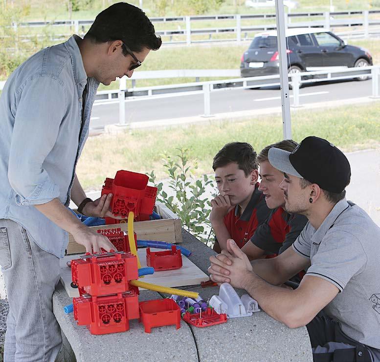 Ein Tag im Basic Camp ist reserviert für den Unterricht im Frey+Cie Zentrum für Systeme (ZESY) in Rothenburg. Auf Aussenplätzen geht es zu und her wie auf einer Baustelle. Hier können Kabel und Dosen «unterputz» montiert werden, dort Bohrer und Dübel ausprobiert werden. Unterstützt wurden die Dozenten der Firma Morach Technik und Würth dieses Jahr auch von zwei Mitarbeitenden der Frey+Cie-Gruppe. Es gab hier nicht nur viel
