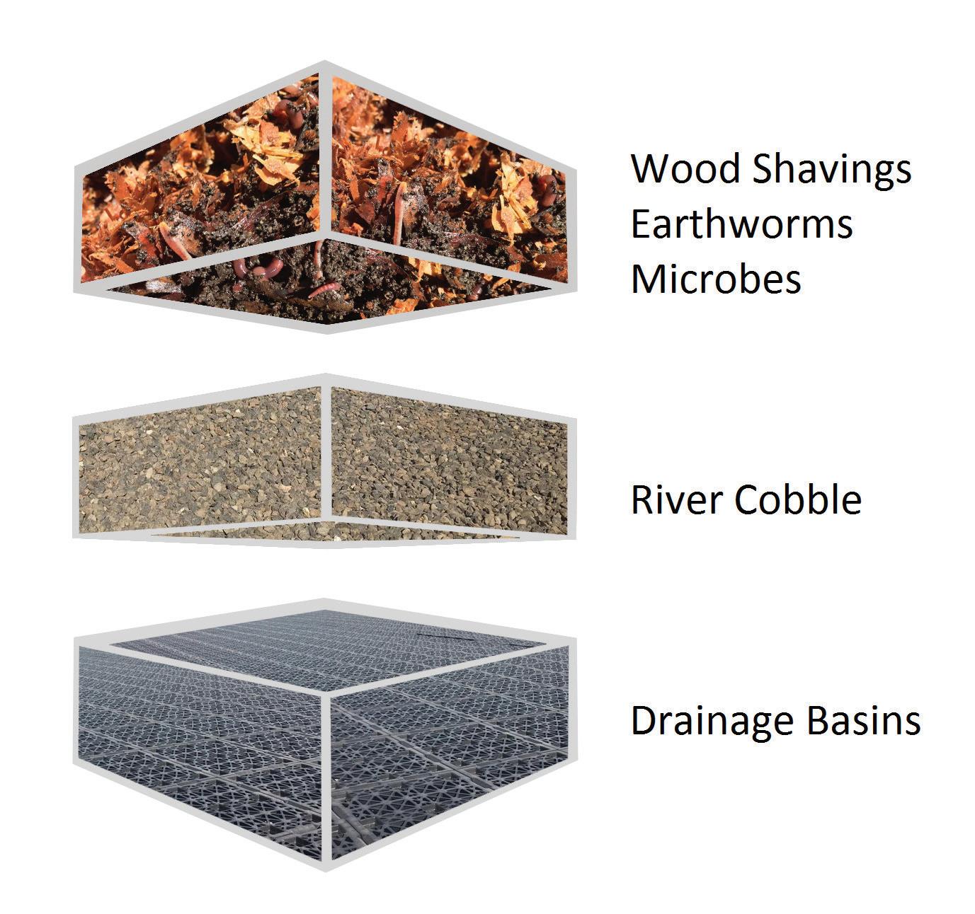In 2020, we installed a BioFiltro composting system, built inside two 40x80 foot beds, that catalyzes the digestive power of earthworms to naturally filter the water after the winemaking process. The system processes up to 10,000 gallons of grey water daily, the equivalent of 600 showers. That water then gets sent to irrigation ponds, where it is used as needed throughout the year.