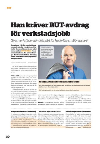 Han kräver RUT-avdrag för verkstadsjobb "Svartverkstäder gör det svårt för hederliga småföretagare" Regeringen vill öka sysselsättningen samt minska svartjobben. Därför får den som lämnar in sin cykel på reparation RUT-AVDRAG för arbetskostnaderna. Nu kräver Sveriges Fordonsverkstäders Förening att det även ska bli avdragsgillt med bilreparationer. TEXT: PETER FREDRIKSSON