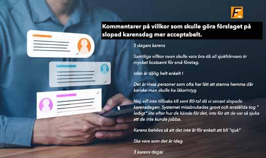 ligt att staten – inte småföretagaren – tar hela eller en betydligt större del av sjuklöneansvaret från dag ett. Annars flyttar man ännu mer ansvar från det gemensamma till enskilda företagare som redan bär en tung börda. Vår undersökning visar också att många företagare kan acceptera förändringar om staten tar ett större ekonomiskt ansvar och om kontrollen skärps, till exempel genom tidigare krav på läkarintyg och tydliga begränsningar för hur många korta frånvarotillfällen som kan ersättas.