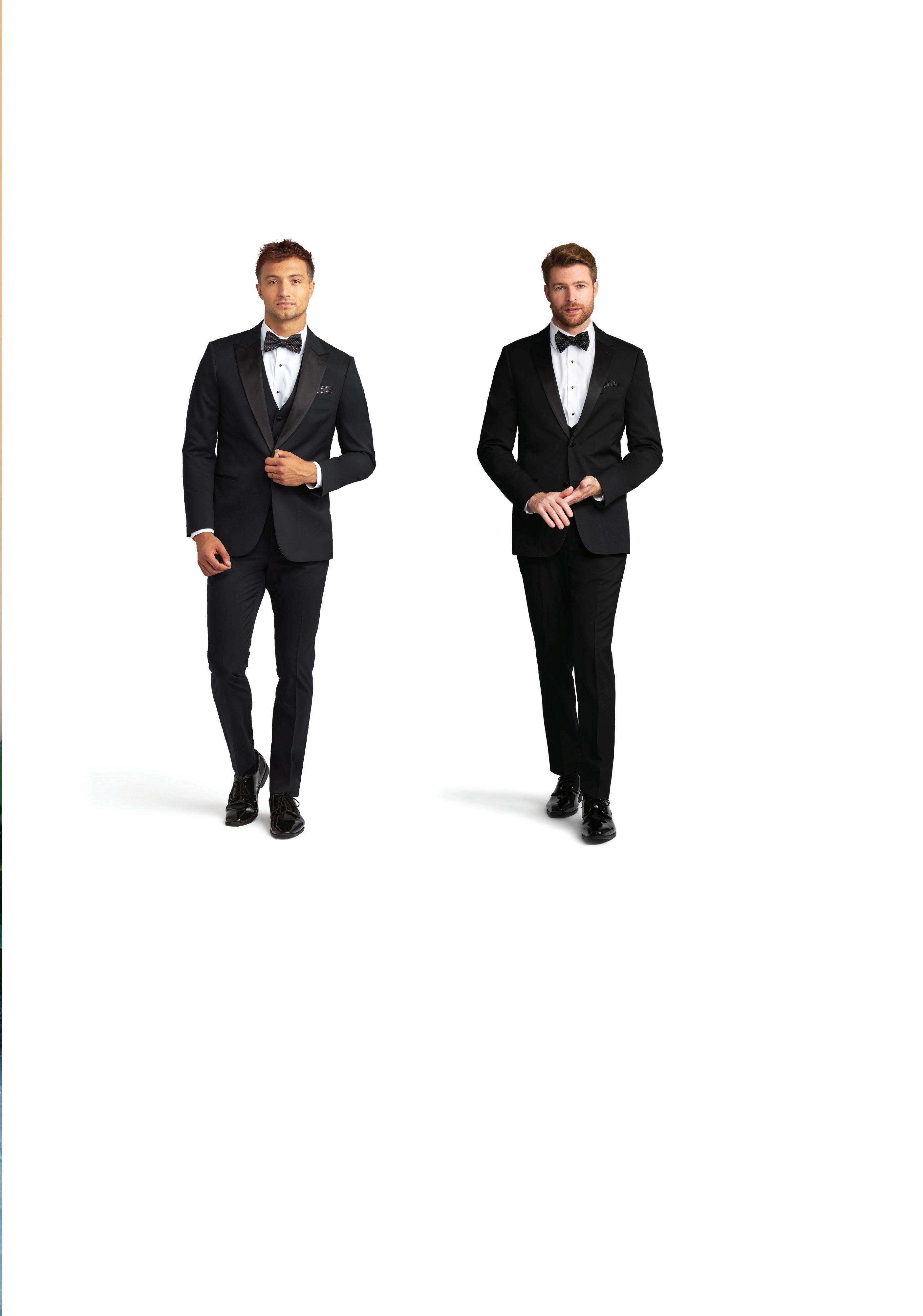 Performance fabric, two -button, notch lapel tuxedo with matching vest. BLACK NOTCH LAPEL TUXEDO