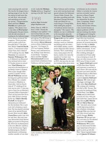 class notes more amazing with each day. She was for the longest time a spitting image of me, but she has started to look more like my wife Kari, who actually had something to do with her arrival.” Congratulations Mark and Kari! Mehul Parekh sent a photo and explains, “The photo I sent in was taken at Pete Levin’s bowling party this past winter, with the sole intention of landing on the hallowed pages of the alumni section of the magazine. Think everyone wants to look at all of our beautiful faces?” I do think that, Mehul! Garrett Smith reports, “I was invited to four (count them, four!) Class of 1997 weddings this year: Rob Travieso was married to Sammy Williamson ’00 in St Michael’s on Memorial Day weekend with at least 30 Quaker alumni in attendance. Paul Masson was married to Krystal Boeren at his family’s home in Roland Park in July, though unfortunately I couldn’t attend. Brook Waldman married his long-time girlfriend Anna Price-Meader in a woodsy ceremony in Monkton in September. And my fourth class of ’97 wedding of the year was my own—I was married to Catie Lee on Martha’s Vineyard, MA in September.” That’s all the news that’s fit to print, folks. Keep it coming! As for me, Claire Cherlin Kosloff, my daughter Alexandra just celebrated her first birthday. She is such a joy and is keeping us quite busy. She has enjoyed meeting many of my special Friends friends. Most recently, Abby Owen Perry paid a visit with her son Sam, who may have won Alexandra’s heart forever. Abby just moved to Princeton, NJ, where her husband James is the new offensive coordinator for the Princeton Tigers’ football program. Finally, I look forward to welcoming another member of our class