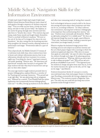 and often time consuming work of vetting their research. Such technological advances created a shift in the discussion among educators about what’s important and what can be cut, according to Montrie. “In today’s information environment, learning how to format a bibliography is less important than authenticating their sources,” she says. “Students must continually ask themselves: Where’s my information coming from? Is it a reliable source?” Yet there are still essential things that must be taught, asserts Montrie. “That’s why ‘backwards design,’ looking at essential questions before you design lessons, is critical.” Montrie employs the backward design process when teaching units on such subjects as academic honesty and fine arts. Each project begins with a meeting in which the students set goals and objectives. (“My role is to ensure their goals are achievable,” she says.) A rubric then guides the students through each stage of the planning process, with such questions as: “What new skills do you want to learn in order to enhance your project?” and “Who will you seek out to provide you with feedback on your work?” “This approach puts the students in charge and gives them more buy-in, so that the teacher becomes the ‘guide on the side, not the ‘sage on the stage,’” says Montrie. Students demonstrate facility of concepts in creative, non-traditional ways, from sock puppet theater to rhyming raps. Recalling a memorable skit during a plagiarism unit, Montrie says, “The students created a Plagiarism Vampire. The only way you could kill this thing was to drive quotation marks through its heart!”