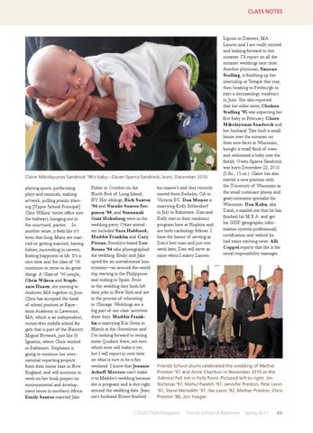 Fisher in October on the North Fork of Long Island, NY. Her siblings, Rich Santos ’94 and Natalie Santos Ferguson ’90, and Susannah Gust Holmberg were in the wedding party. Other attendees included Sara Hubbard, Maddie Franklin and Cary Pirone; Brooklyn-based Lou Rouse ’94 who photographed the wedding. Emily and Jake opted for an untraditional honeymoon—an around-the-world trip starting in the Philippines and ending in Spain. Prior to the wedding they both left their jobs in New York and are in the process of relocating to Chicago. Weddings are a big part of our class’ activities these days. Maddie Franklin is marrying Kai Gross in March at the Greenbrier and I’m looking forward to seeing some Quakers there, not sure which ones will make it yet, but I will report in next time on what is sure to be a fun weekend. I know that Jeannie Achuff Morrow can’t make it to Maddie’s wedding because she is pregnant and is due right around the wedding date. Jeannie’s husband Ernest finished