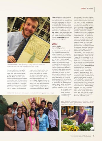 2007. Lauren Marks lmarks617@gmail.com It’s an exciting year for the Class of 2007, since many graduated from college this year and will embark on a new journey that may include more schooling, an exciting job opportunity or — for some — traveling. Holly Heller writes, “It has been an exciting and busy last few months for me, I graduated from Gettysburg College JIMMY BIGWOOD ‘07 with the Washington College diploma awarded to his in May and am now working in the great-great-great-great-great-grandfather John Scott in 1783. Leeward Islands for Sail Caribbean. I live aboard a large sailboat and teach International Evening: Sharing Our English section! Natalie writes, “It’s high school-aged kids how to sail. Cultures, Sharing Ourselves,” showbeen an amazing 10 months here, The students live aboard the boats cased food, music, art and cultures and it’s really hard to say goodbye. with the staff; in addition to learning of Latin America, Asia and Africa. For now, I’m heading back to the how to sail during the three weeks Natalie West just finished up her States, but I’m hoping to be back in they’re here, we find lots of time for English teaching assistantship in Nepal. Nepal again sometime soon!” This island exploration. This fall I will be stuAt the end of class 10, Nepali students summer, Katie Minton celebrated her dent teaching the first grade in Hanover, take a massive exam called the School one-year mark in Madagascar with the Pa., which I hope will be the beginning Leaving Certificate (SLC), which basiPeace Corps! She’s been busy working of a long career.” Not far from Gettyscally determines the rest of their lives. on AIDS and public health projects, burg, Chiara Olivi graduated from Natalie’s class from last year just took including painting a giant world map Dickinson College with a major in Spanthe SLC in March and all passed the at her village’s middle school. Jackie ish and double minor in Latin American studies and Italian. NATALIE WEST ‘06 with some of her students from her English teaching assistantship in Nepal. For the summer she worked through