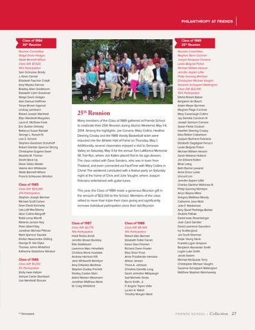 Class of 1985 Class Gift: $24,280 21% Participation Stephen Joseph Berman Michael Scott Cohen Sean David Kennedy Lisa Lott MacGibeny Alice Collins Margraff Robb Leroy Merritt Melanie Jensen Ney Peter Albert Ney Jonathan Michael Pittman Mark Spencer Saudek Kirsten Newcombe Shilling George R. Van Dyke Thomas Johns Whiteford Katherine Gladstone Windsor