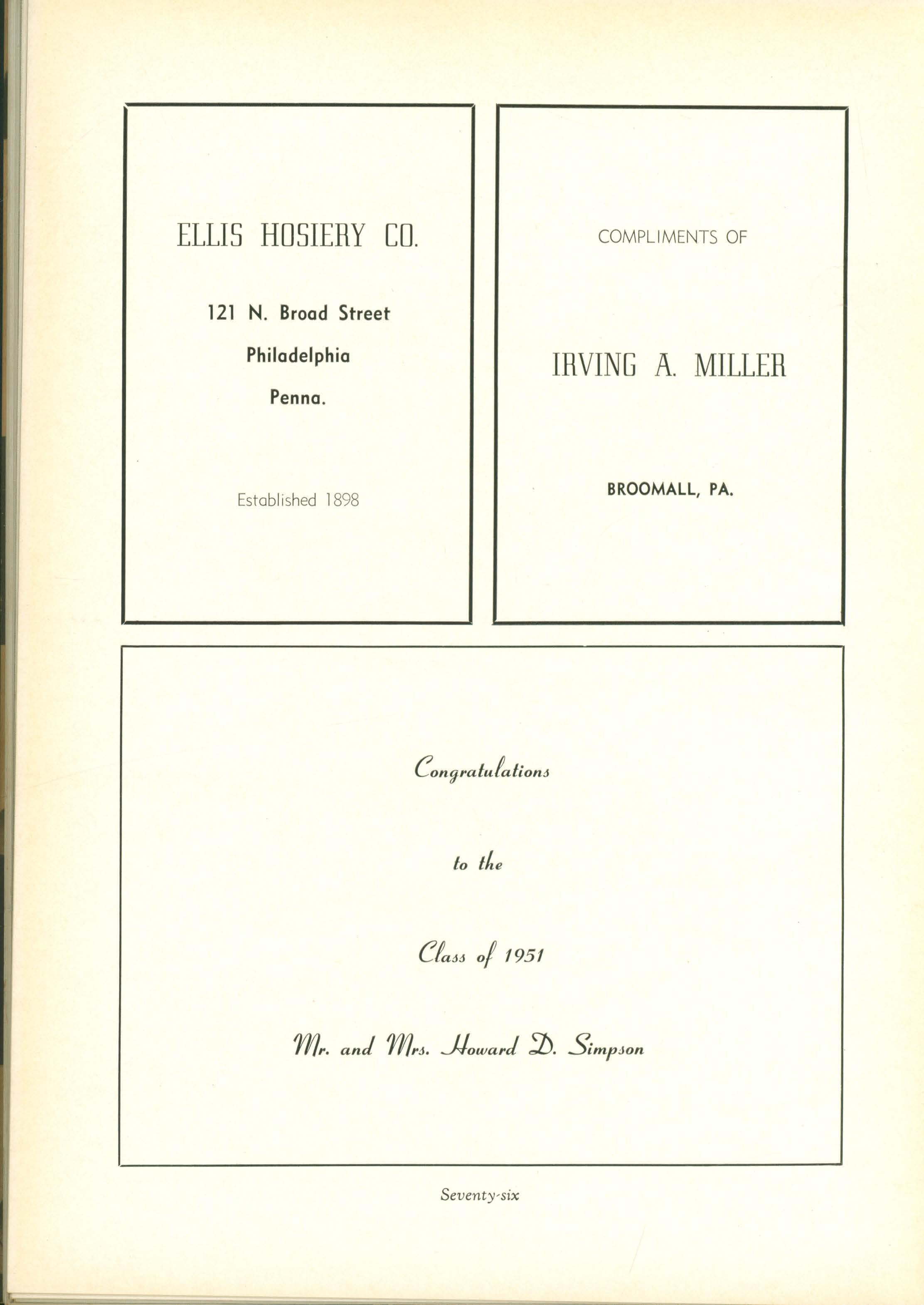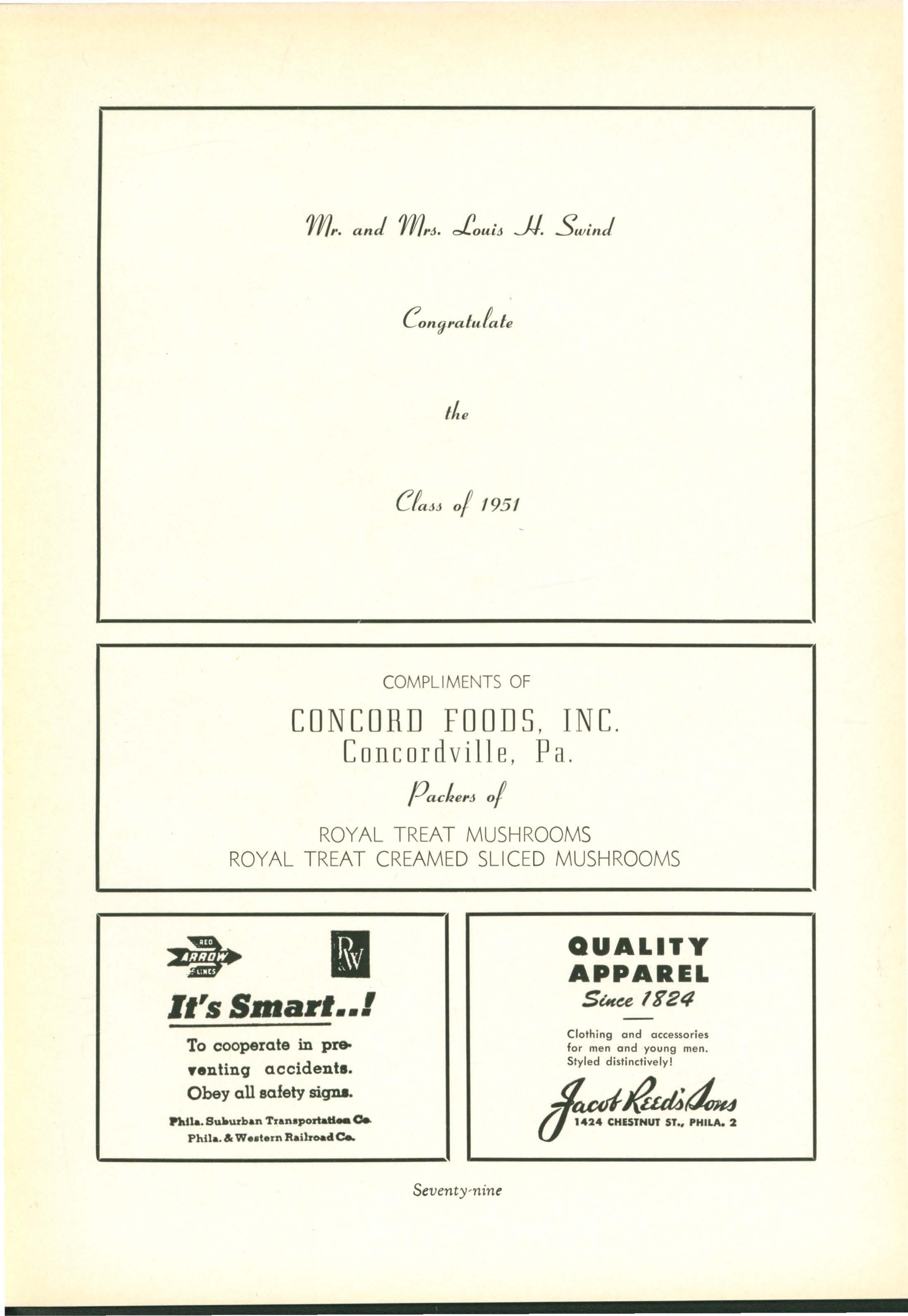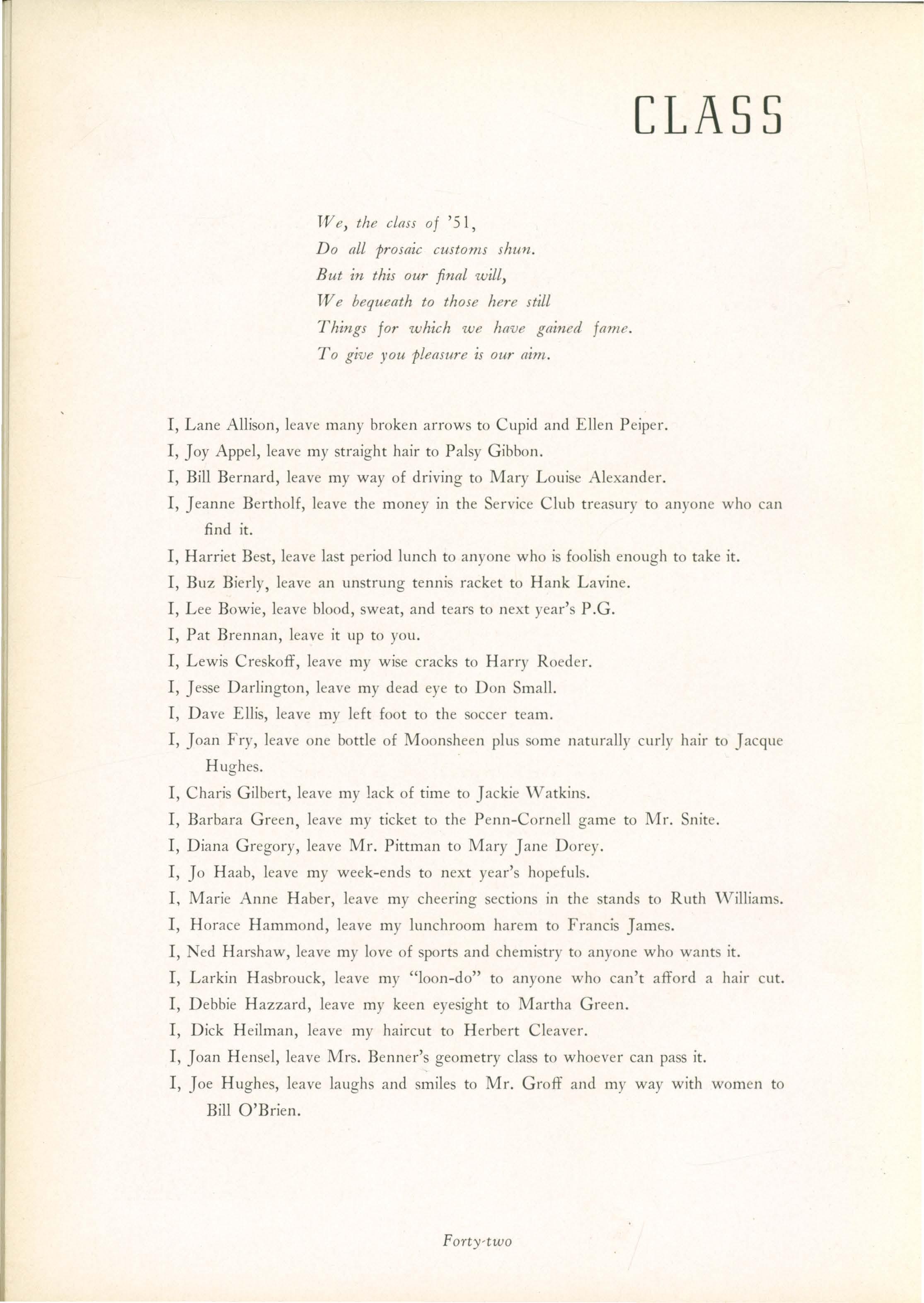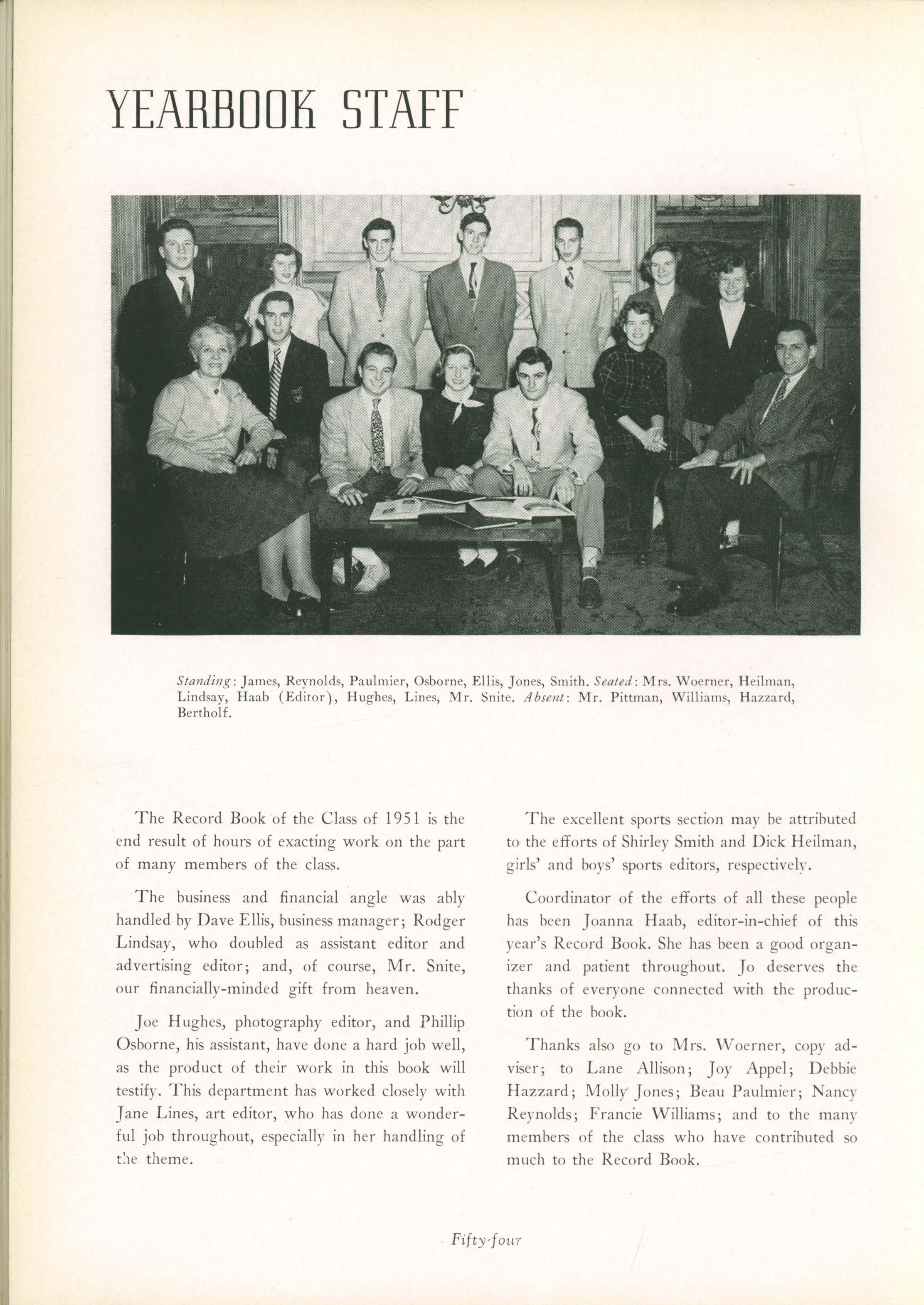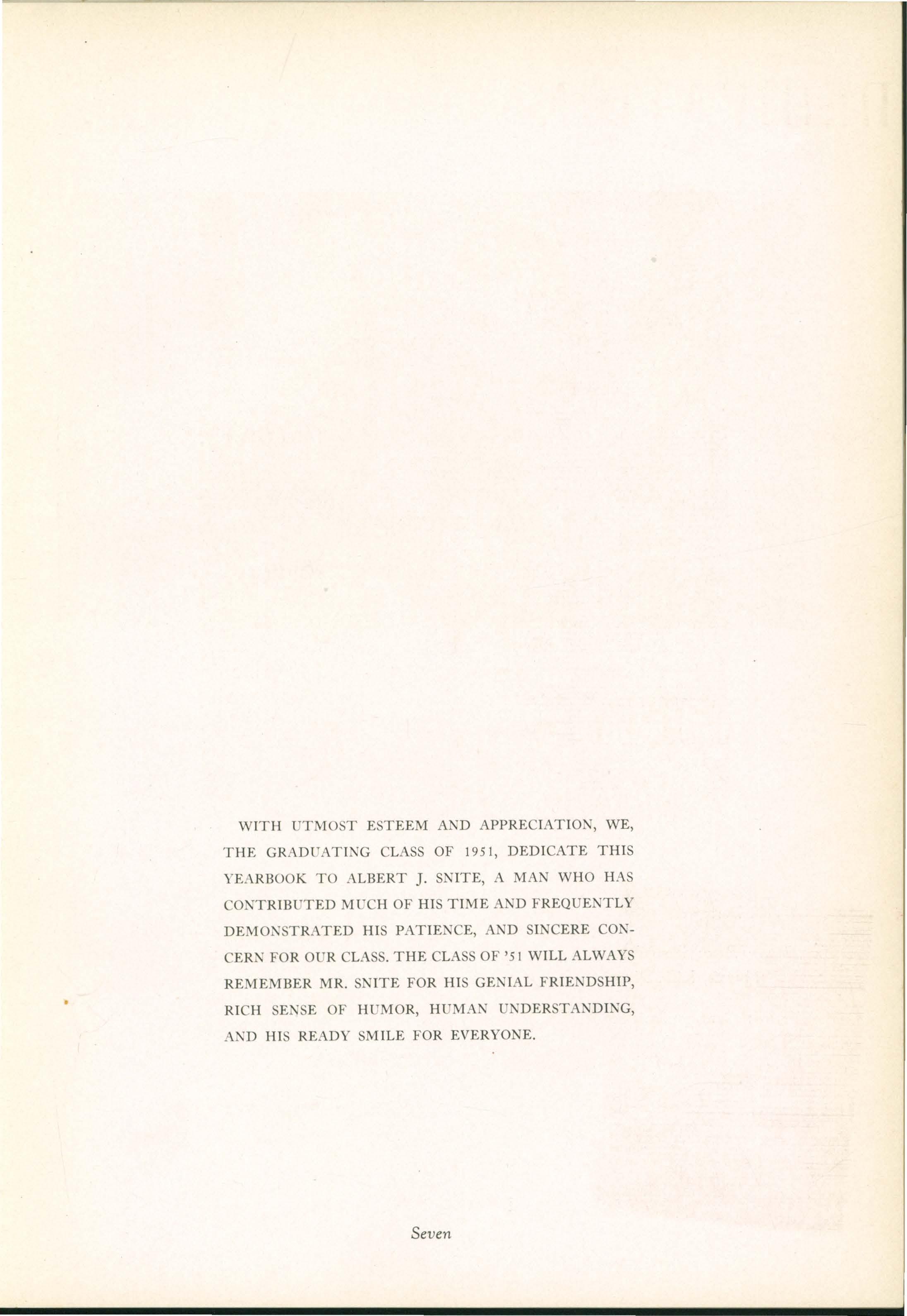 WITH UTMOST ESTEEM AND APPRECIATION, WE, THE GRADUATING CLASS OF 1951, DEDICATE THIS YEARBOOK TO ALBERT J. SNITE, A MAN WHO HAS CONTRIBUTED MUCH OF HIS TIME AND FREQUENTLY DEMONSTRATED HIS PATIENCE, A D SINCERE CONCERN FOR OUR CLASS. THE CLASS OF '51 WILL ALWAYS REMEMBER MR. SNITE FOR HIS GENIAL FRIENDSHIP, RICH SENSE OF HUMOR, HUMAN UNDERSTANDING, AND HIS READY SMILE FOR EVERYONE.