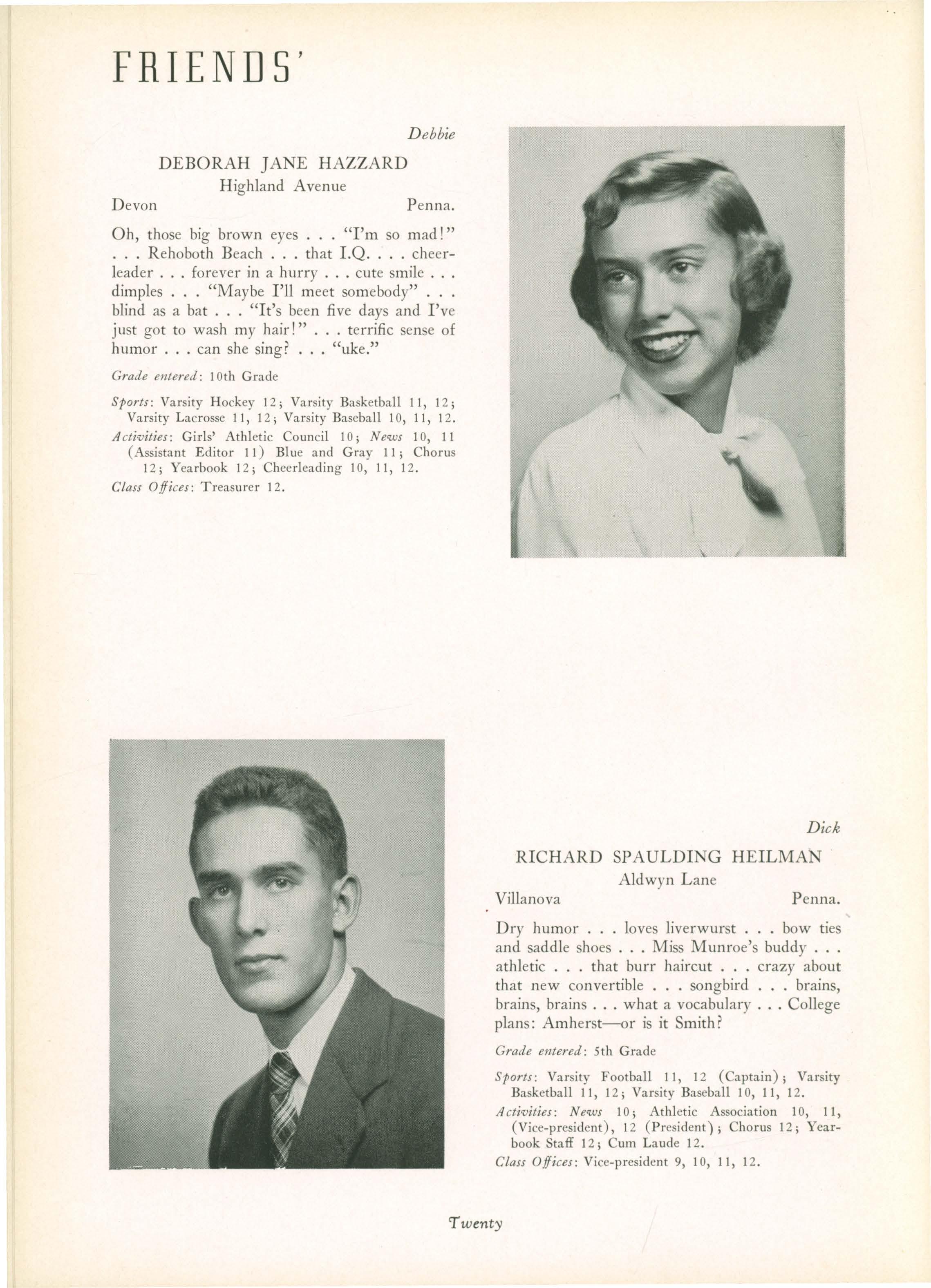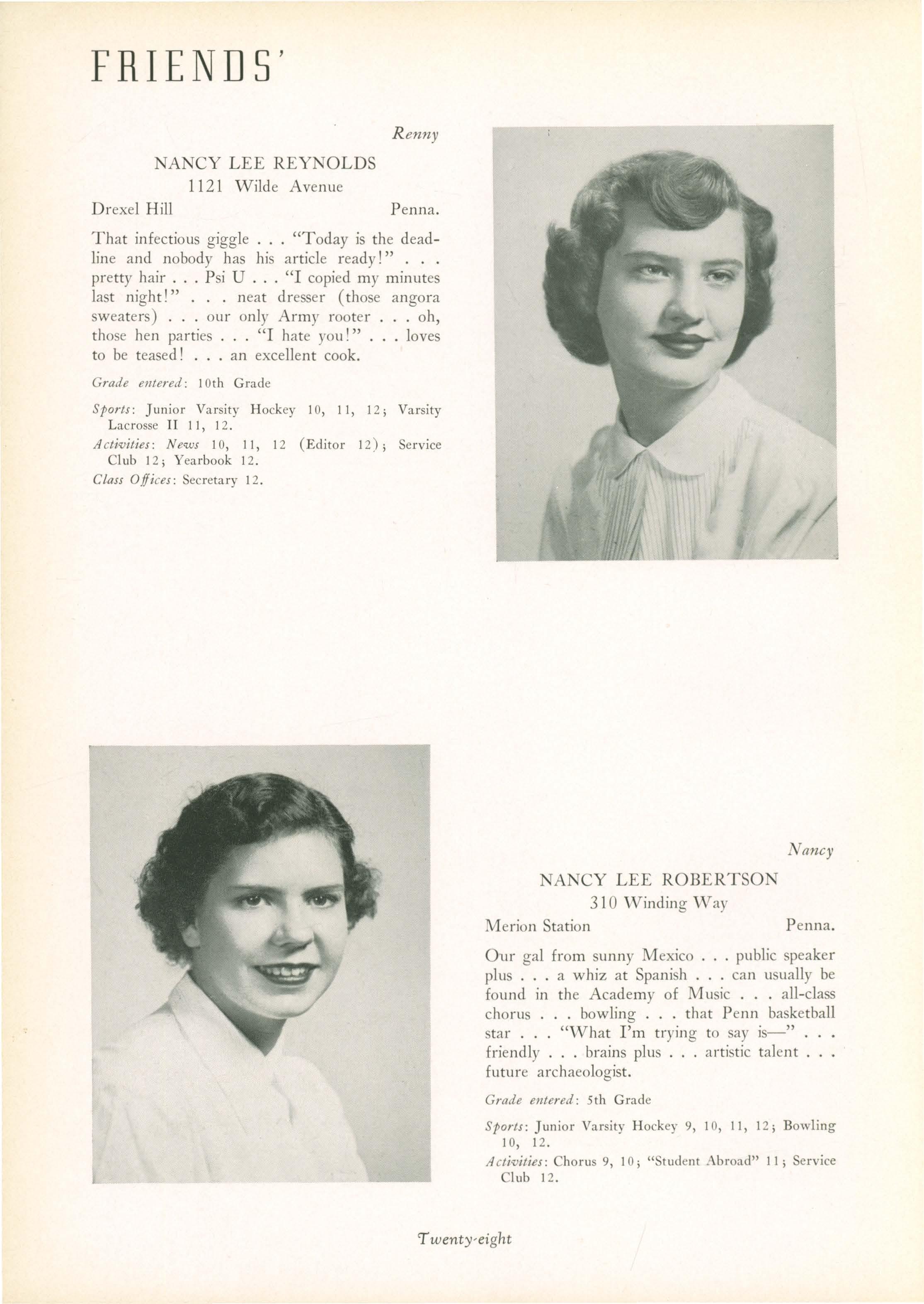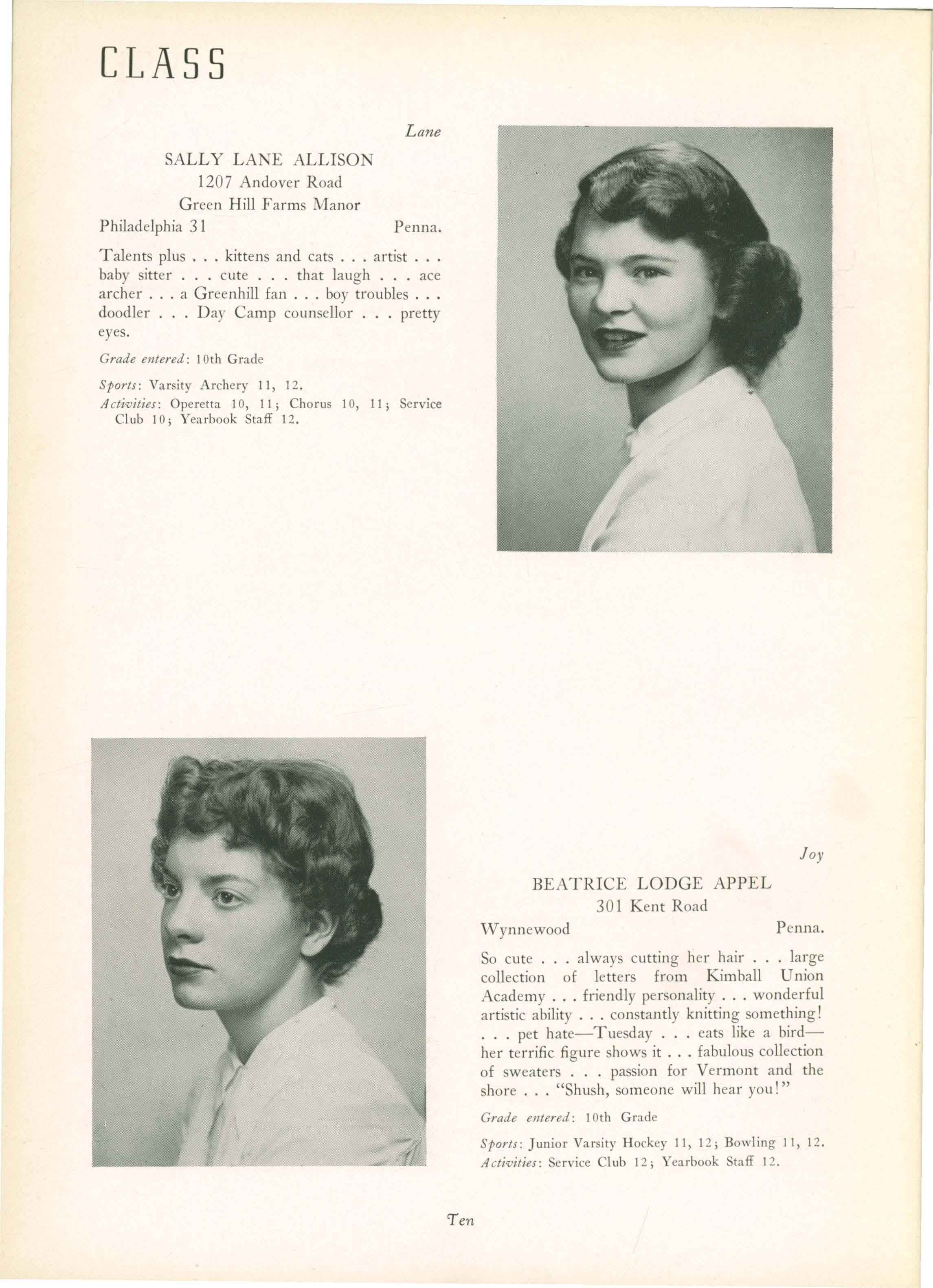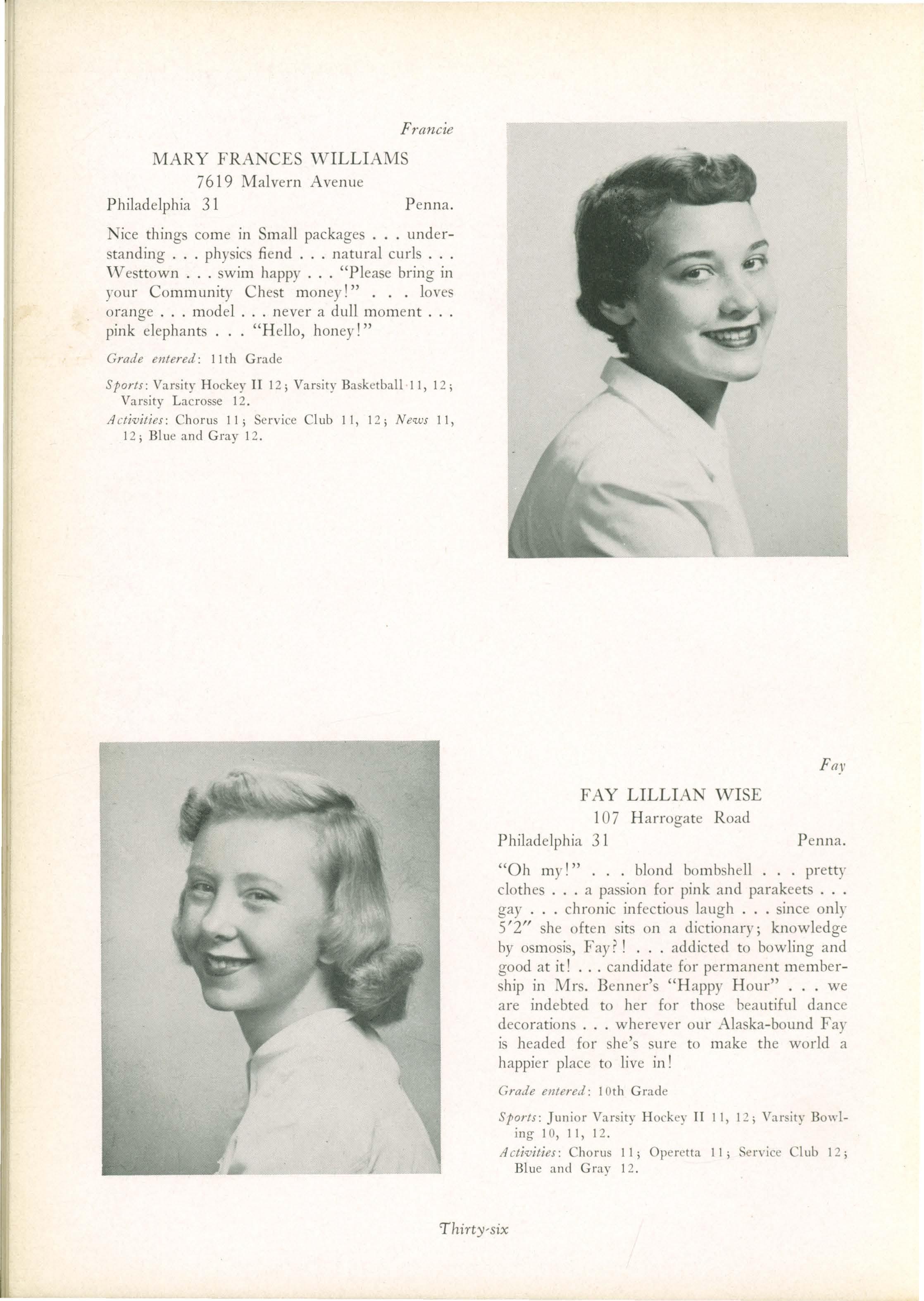 she speaks French I female scientist th e onl y on e on th e Servi ce Committ ee wh o ca n a dd - tr eas ur e r ... she's a lw ays th er e when yo u n ee d h er plays th e piano wonderfully "Guess what! I'm go in g to th e farm this weekend! " . .. c ut es t twinkl e in he r eye .. . hard worker "A heavy hitt e r in th e bac kfi eld- " "Have a ll th e committees fo r th e Senior Prom m et? "