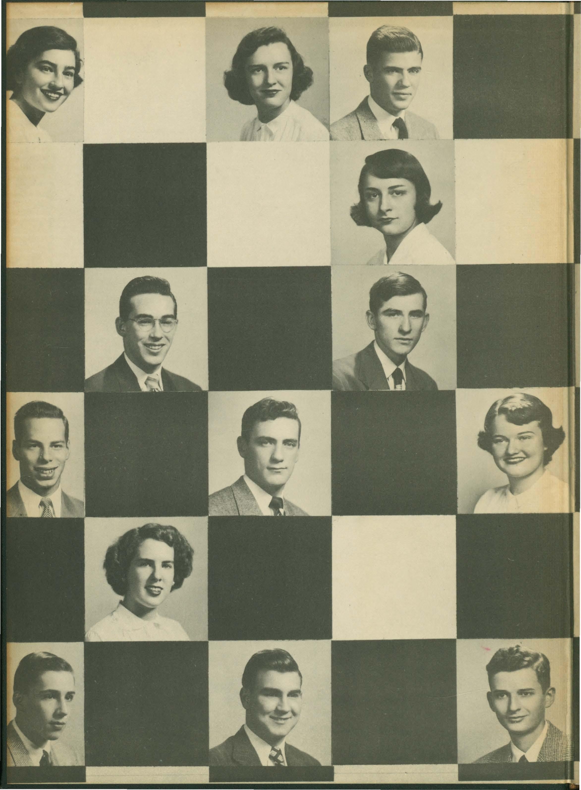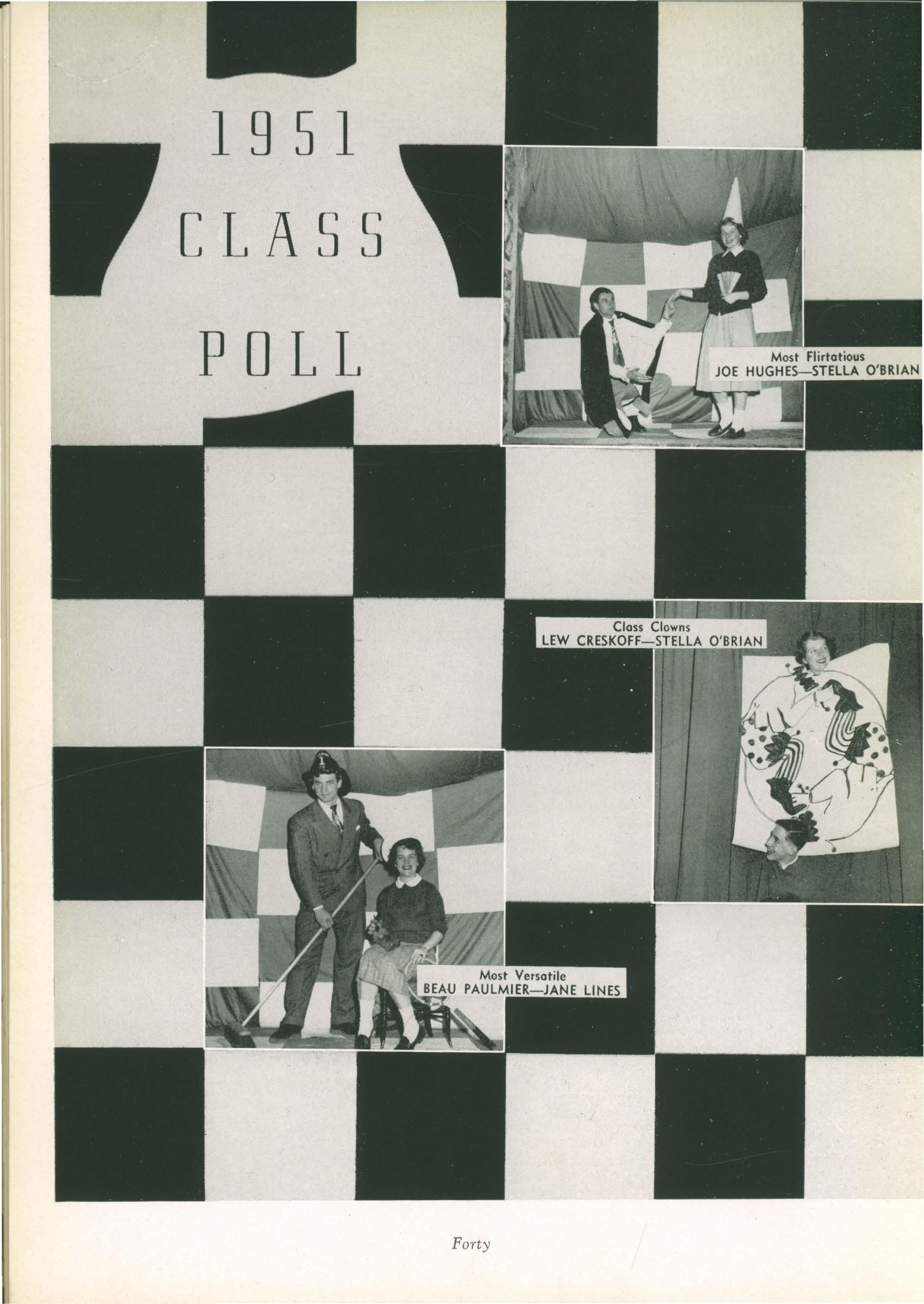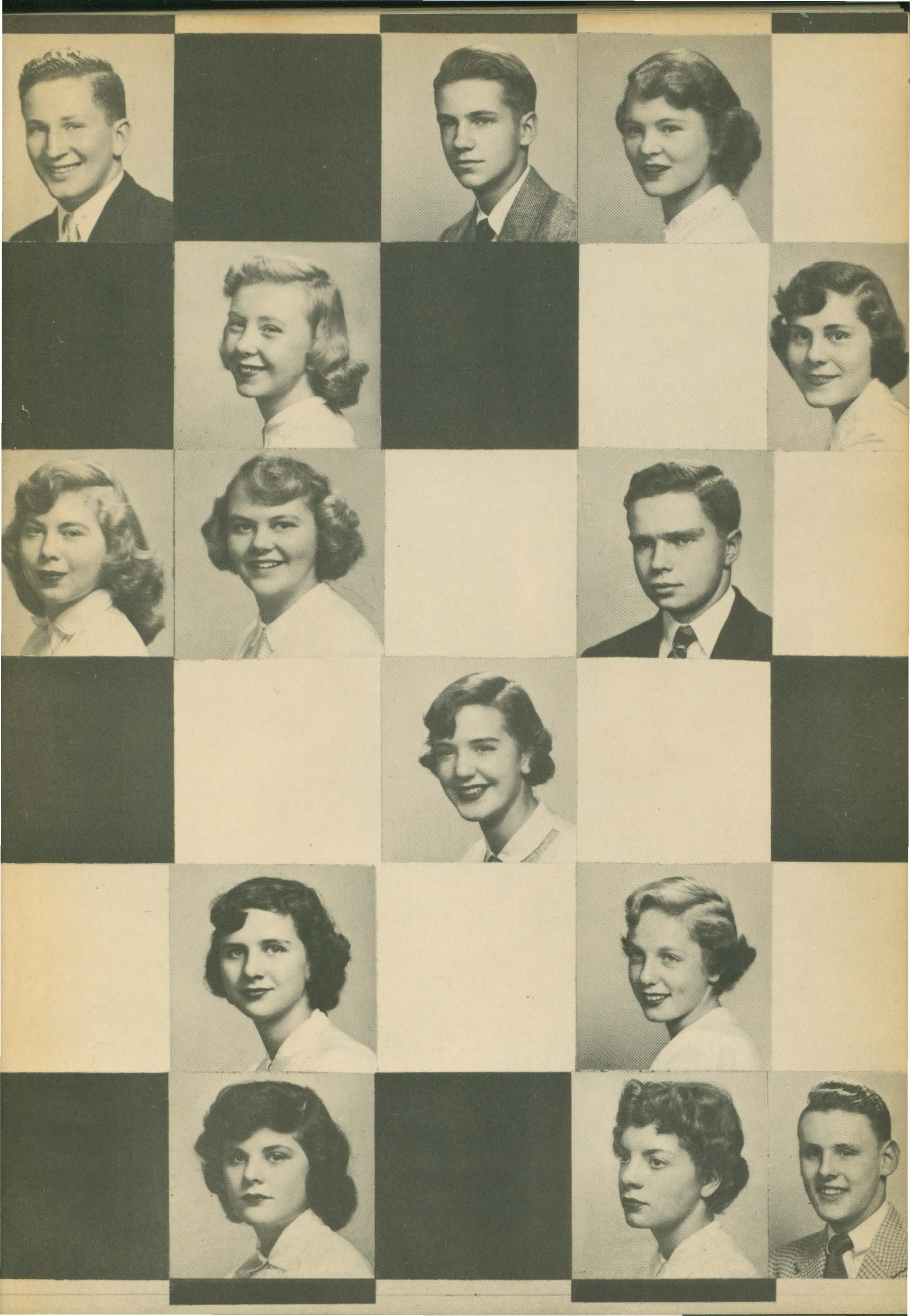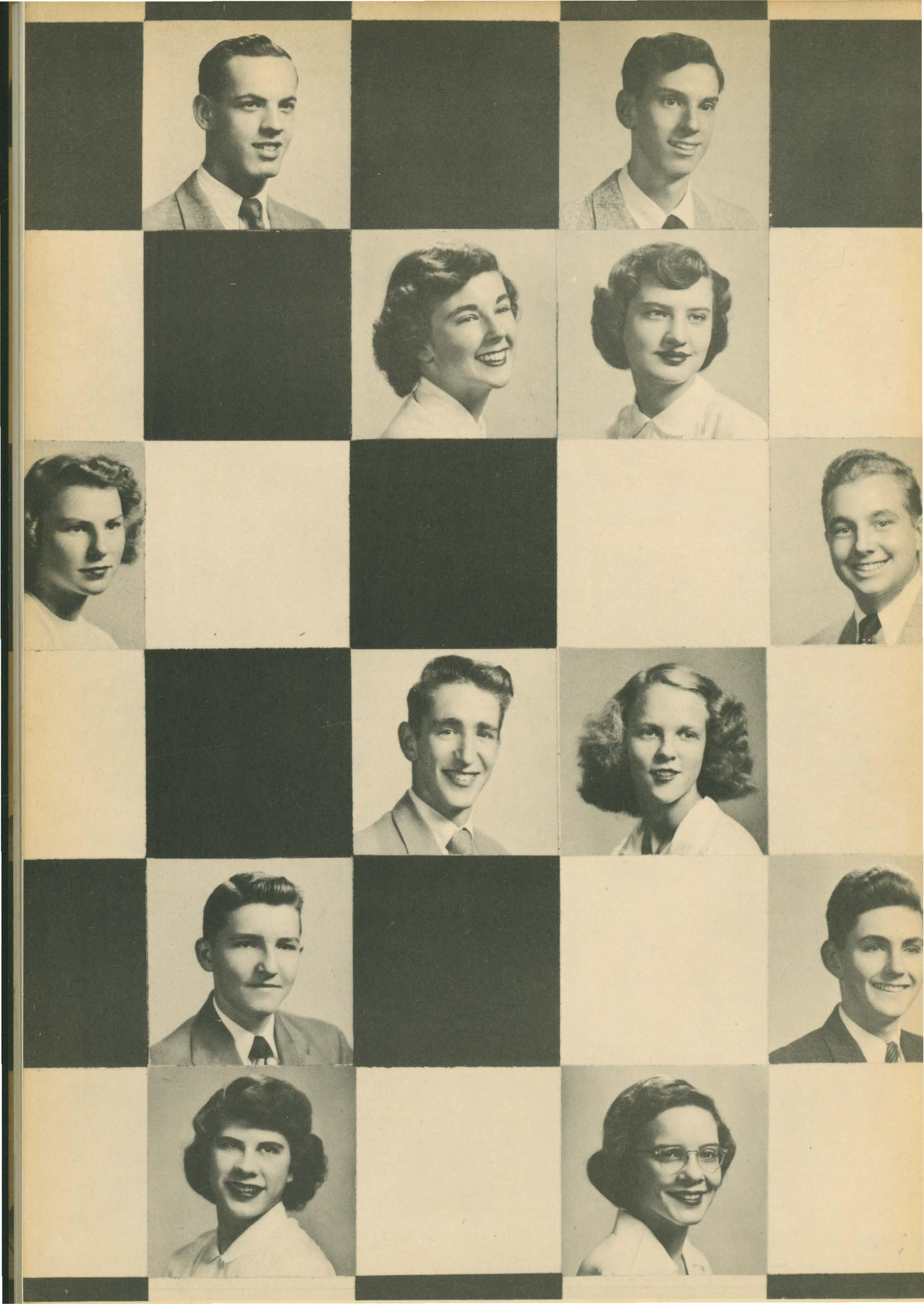 Our cas tl e w as n o bl y r eig n ed o ve r by Kin g P a ul J a m es a nd Qu ee n M o ll y J o n es, o ur class pr es id e nt s. Th e Bi shops, r epr ese ntin g o ur vi ce -pr es id e nt s, w e r e J oa nn a H aa b and Di c k H e ilm a n; whil e in th e im age o f th e Kni g ht s w e r e o ur sec r et a ri es , N a n cy R ey n old s a nd D a ve E llis, wh o kept th e sc ro ll s o f th e Cla ss o f 1951 in o rd e r. R o undin g o ut th e a dmini str a ti o n w e r e th e kee pe rs o f th e r oya l fund s, tr eas ur e r s, D e bbi e H a zz a rd a nd R o d ge r Lind say , wh o w e r e r epr ese nt ed by th e R oo k ( n o t t o be c o nfu se d in pr o nun c ia ti o n with ce rtain m emb e rs o f th e und e rw o rld! ).