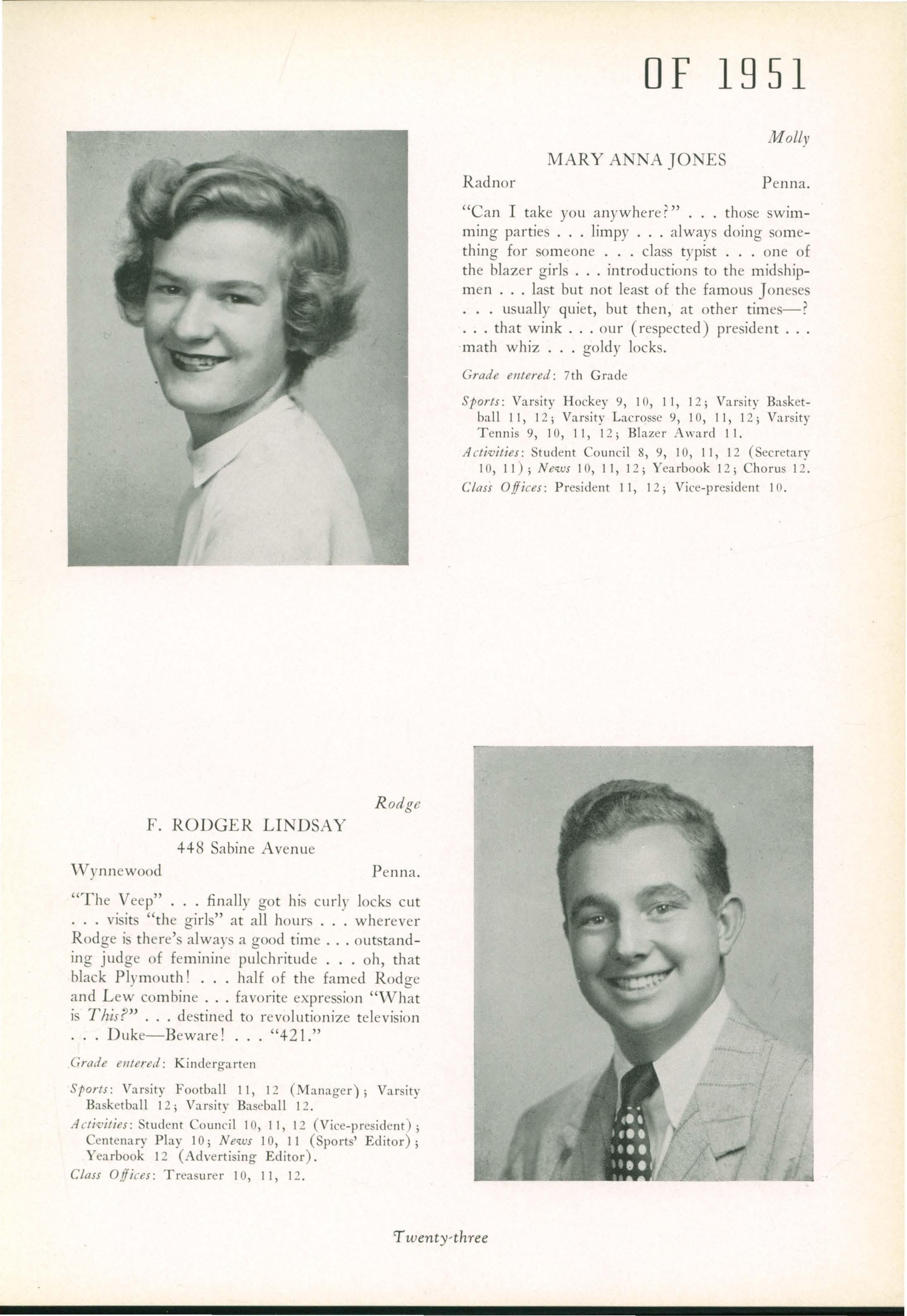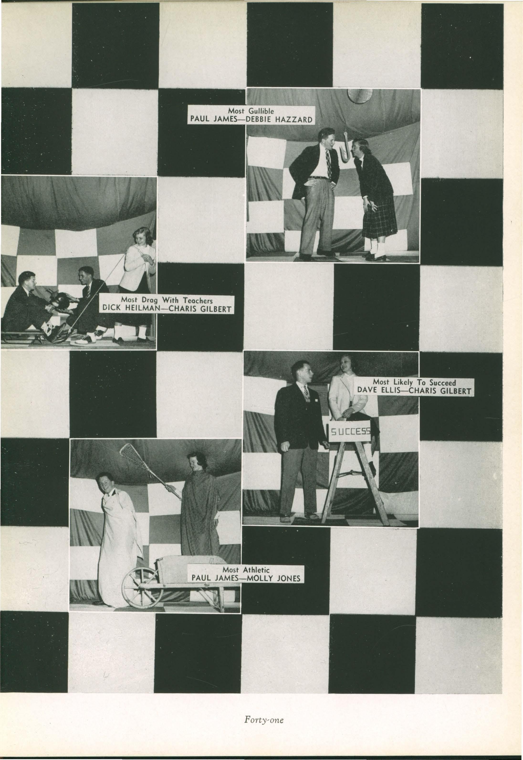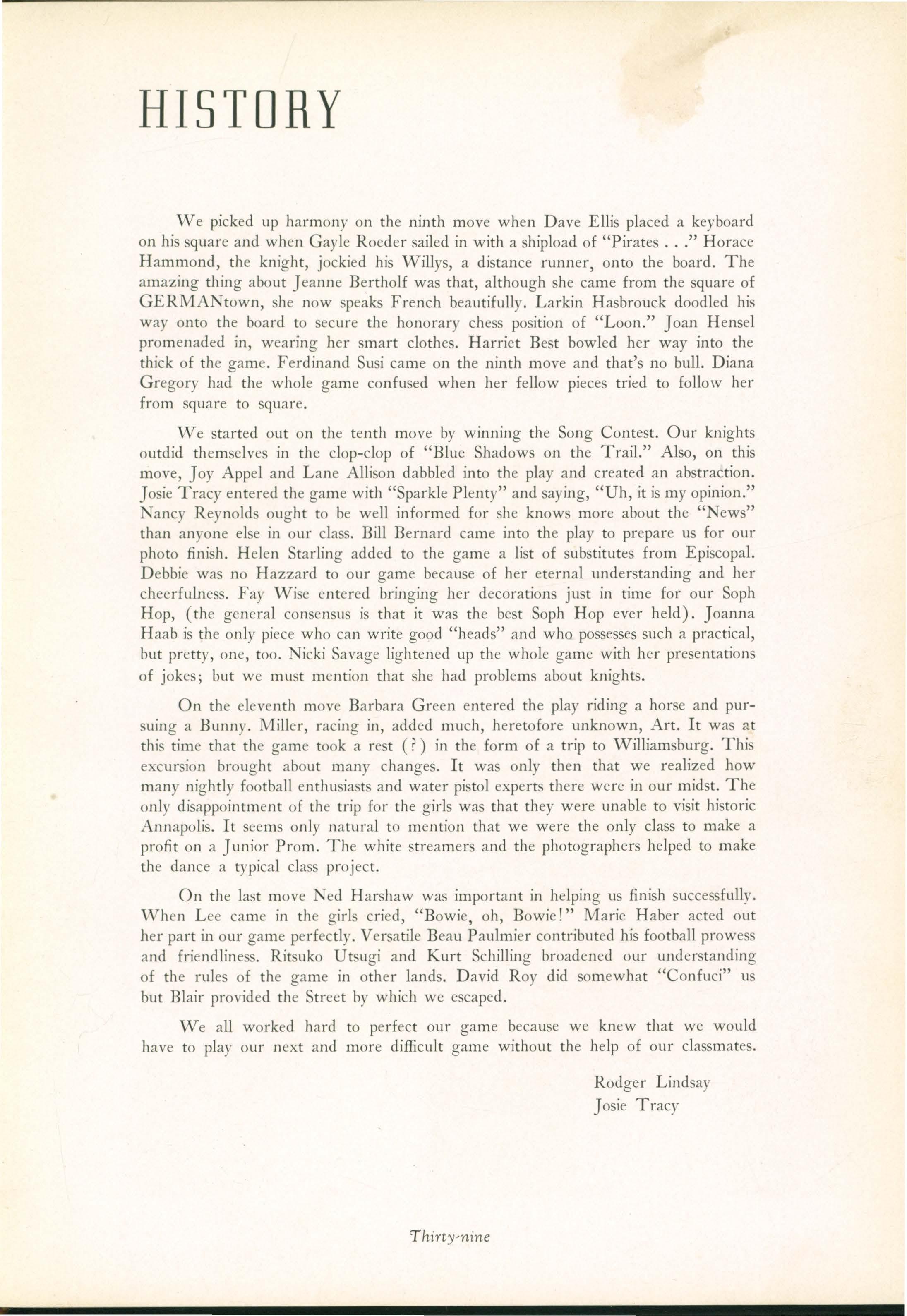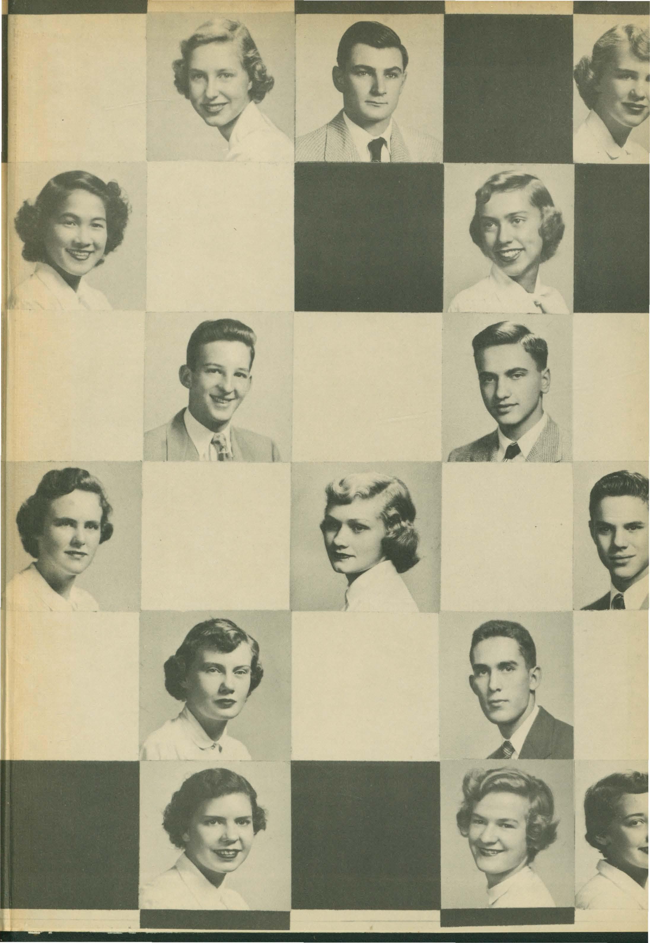 Our cas tl e w as n o bl y r eig n ed o ve r by Kin g P a ul J a m es a nd Qu ee n M o ll y J o n es, o ur class pr es id e nt s. Th e Bi shops, r epr ese ntin g o ur vi ce -pr es id e nt s, w e r e J oa nn a H aa b and Di c k H e ilm a n; whil e in th e im age o f th e Kni g ht s w e r e o ur sec r et a ri es , N a n cy R ey n old s a nd D a ve E llis, wh o kept th e sc ro ll s o f th e Cla ss o f 1951 in o rd e r. R o undin g o ut th e a dmini str a ti o n w e r e th e kee pe rs o f th e r oya l fund s, tr eas ur e r s, D e bbi e H a zz a rd a nd R o d ge r Lind say , wh o w e r e r epr ese nt ed by th e R oo k ( n o t t o be c o nfu se d in pr o nun c ia ti o n with ce rtain m emb e rs o f th e und e rw o rld! ).