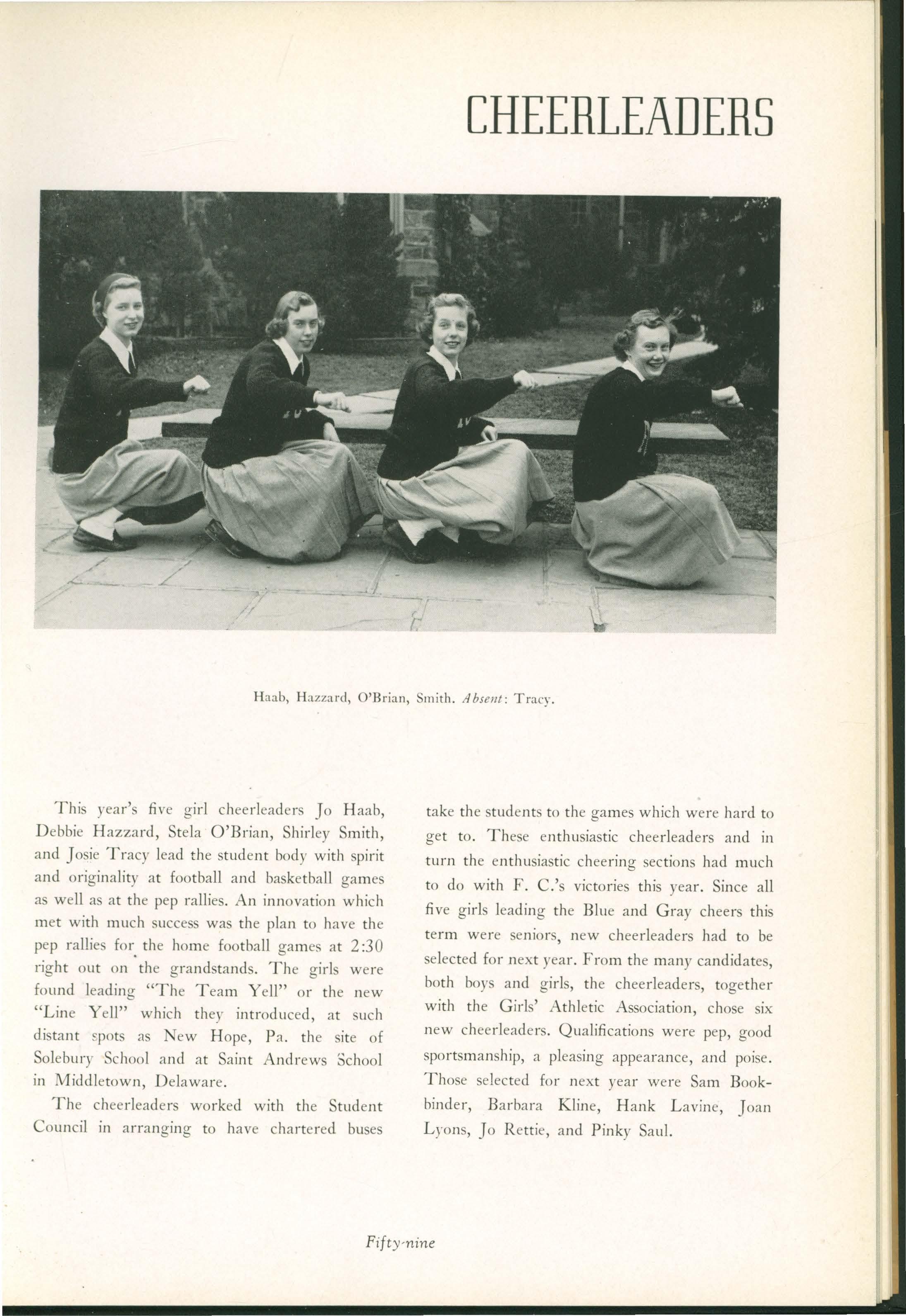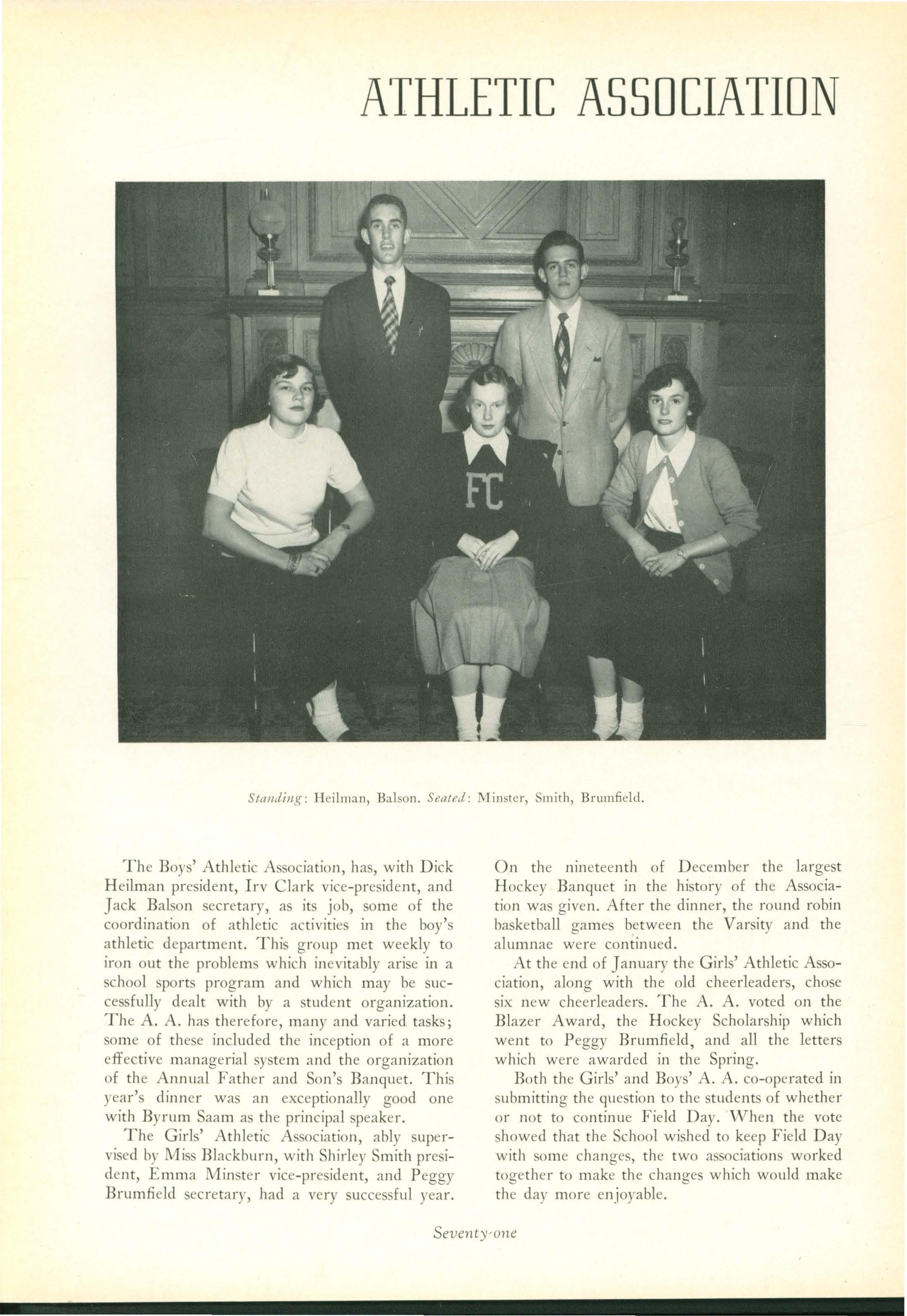 A t th e end o f J a nu a r y th e Girl s' A thl et ic Assoc ia ti o n , a lo n g w ith th e old c hee rl ea d e rs, c hose six n ew c hee rl ea d e rs Th e A. A vo t ed o n th e Blaze r A w a rd , th e H oc key Sc hol a r ship whi c h w e nt t o P eggy Brumfield, a n d a ll th e l ett er s whi c h w ere a w a rd ed in th e Sprin g