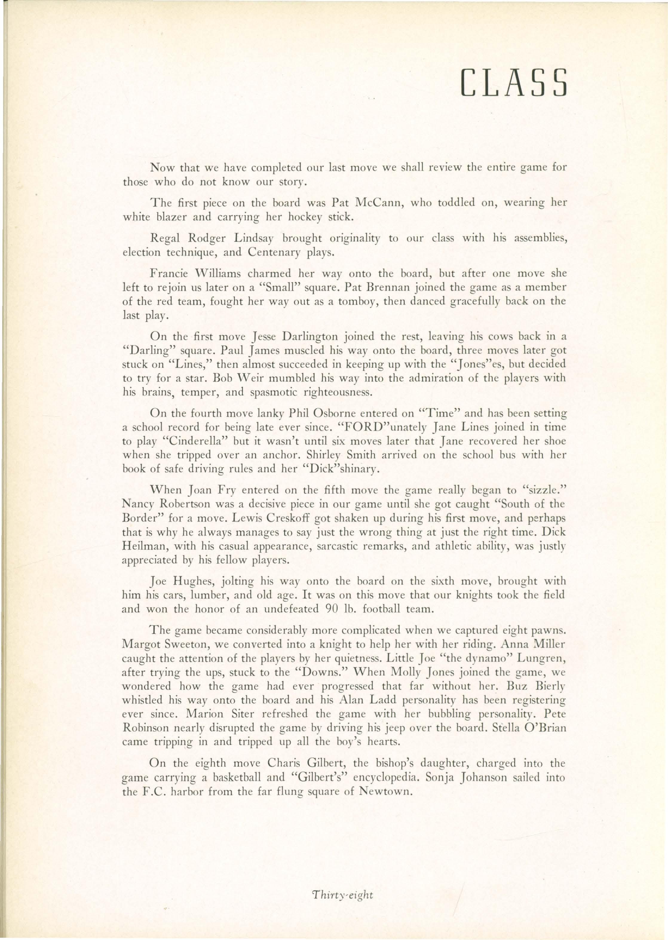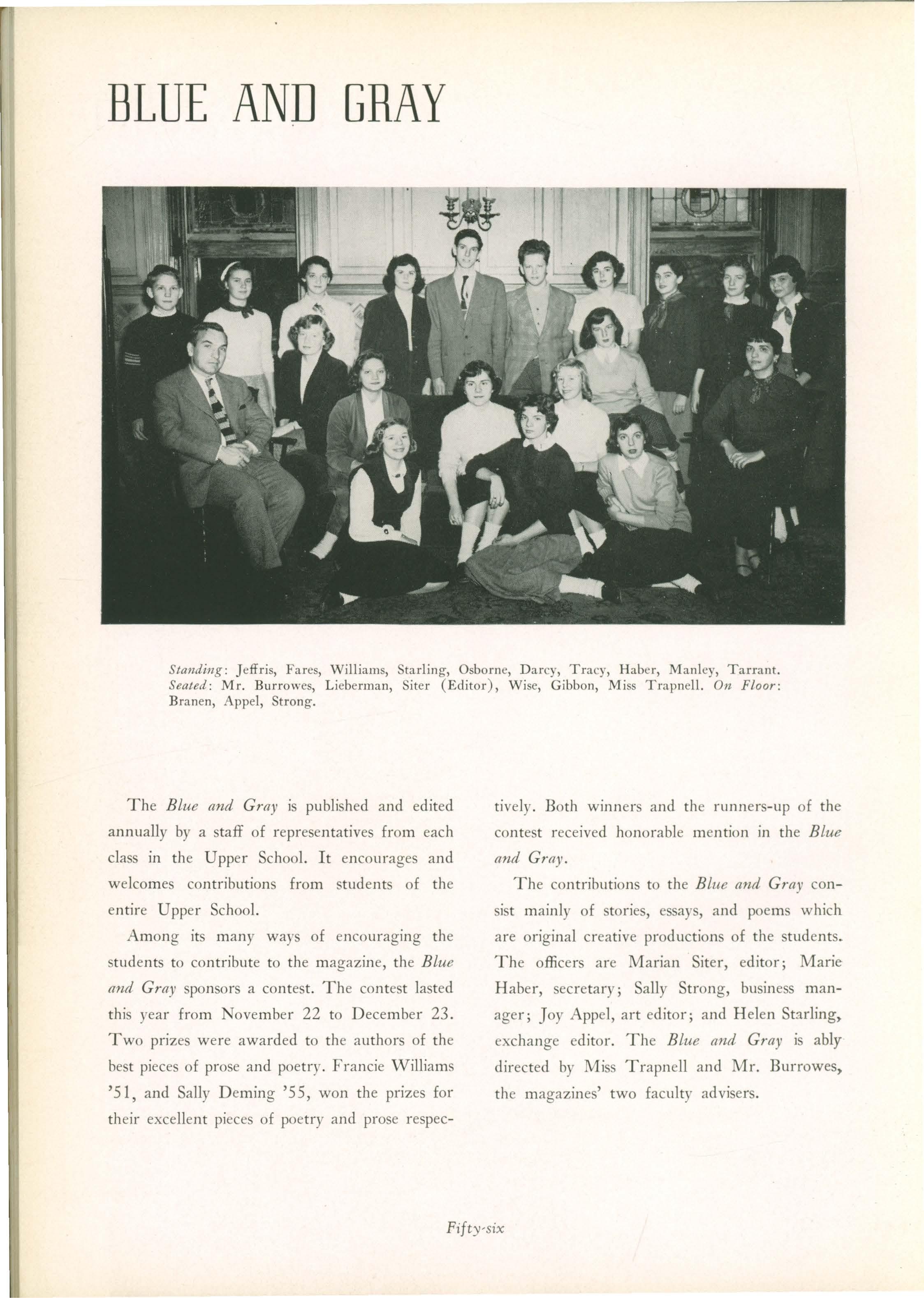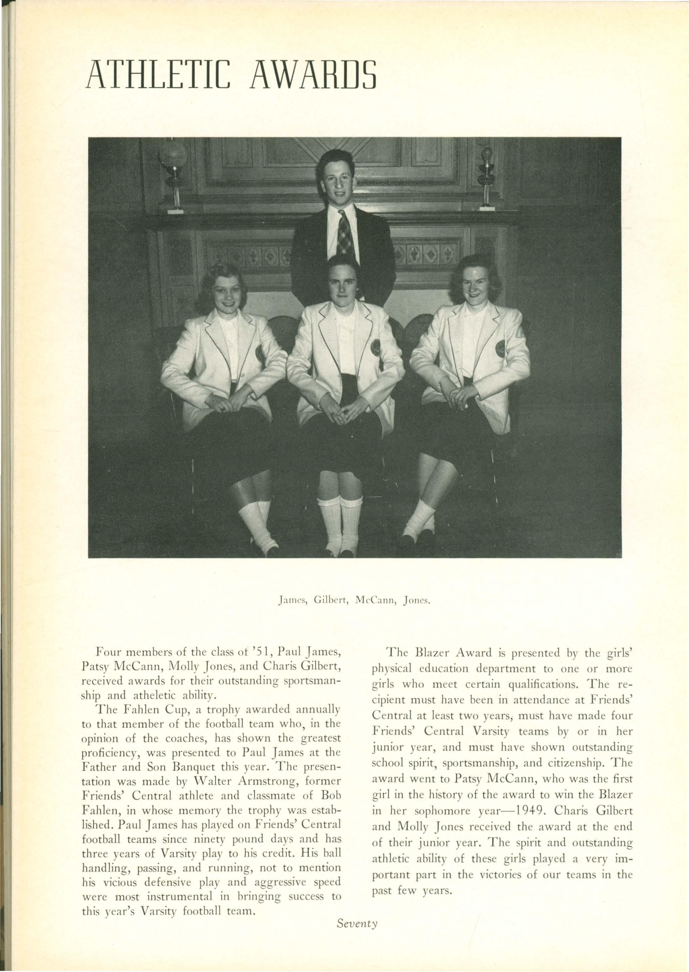 a w a r d w e nt to P a tsy M cC a nn, w ho w as th e fir st g irl in th e hi stor y o f th e a w a rd to win th e Bl aze r in h e r so ph o m o r e yea r- 19 4 9. C ha ri s Gilb e rt a n d M oll y J o n es r ece iv ed th e awa rd a t th e e nd o f th eir j uni o r yea r. Th e spirit a n d o ut st a n di n g