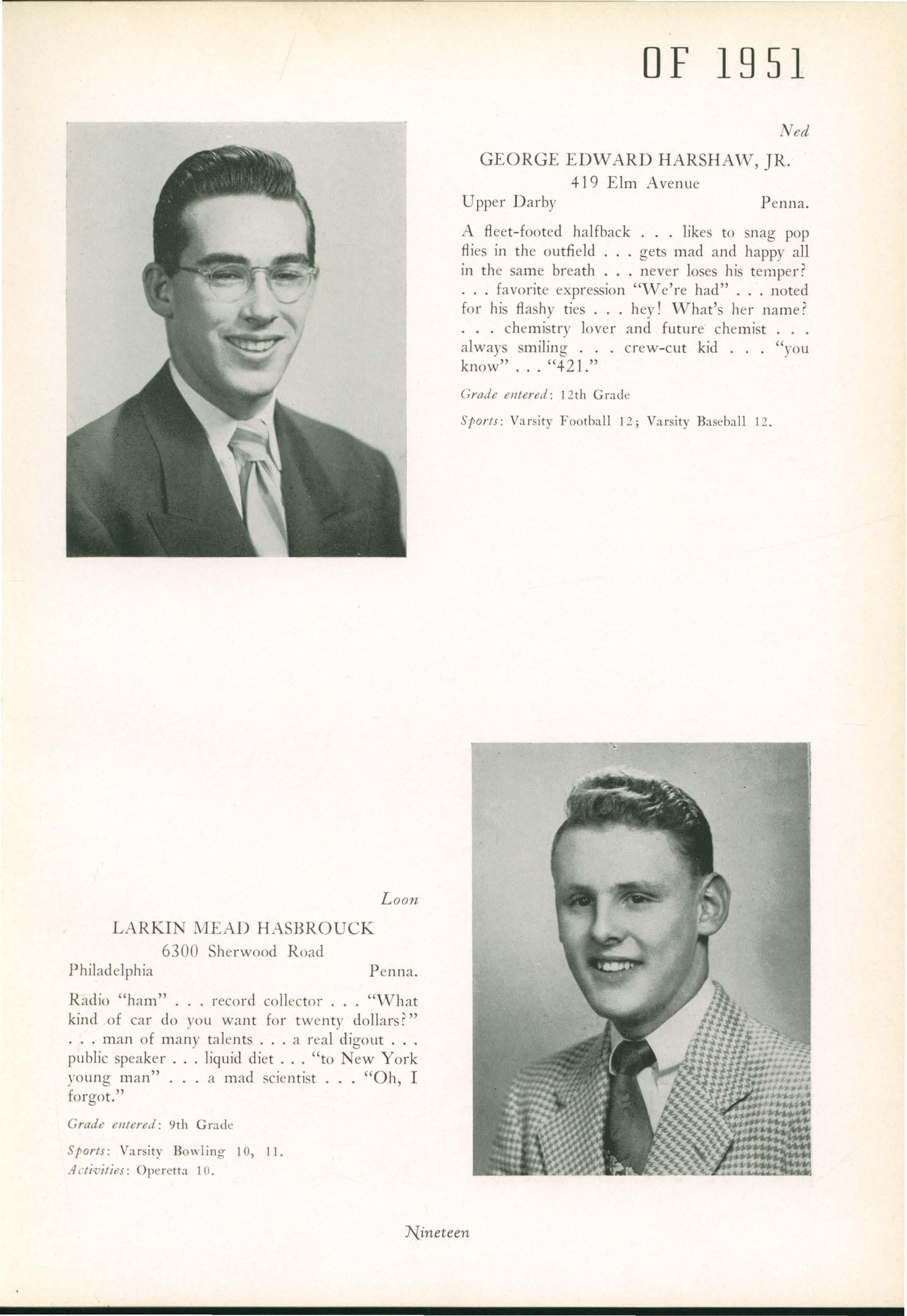 His favorite haunt is almost any library . .. football kept him in shape in the fall ... main hobby is to keep that boat in Maryland floating . . . a fresh air fiend who never wears a coat still wearing that so lid blue tie a weekend night owl a handsome one woman's man, one a w ee k that is mad man behind th e wheel usually qui e t but interested . . . will do most anything for you "421."