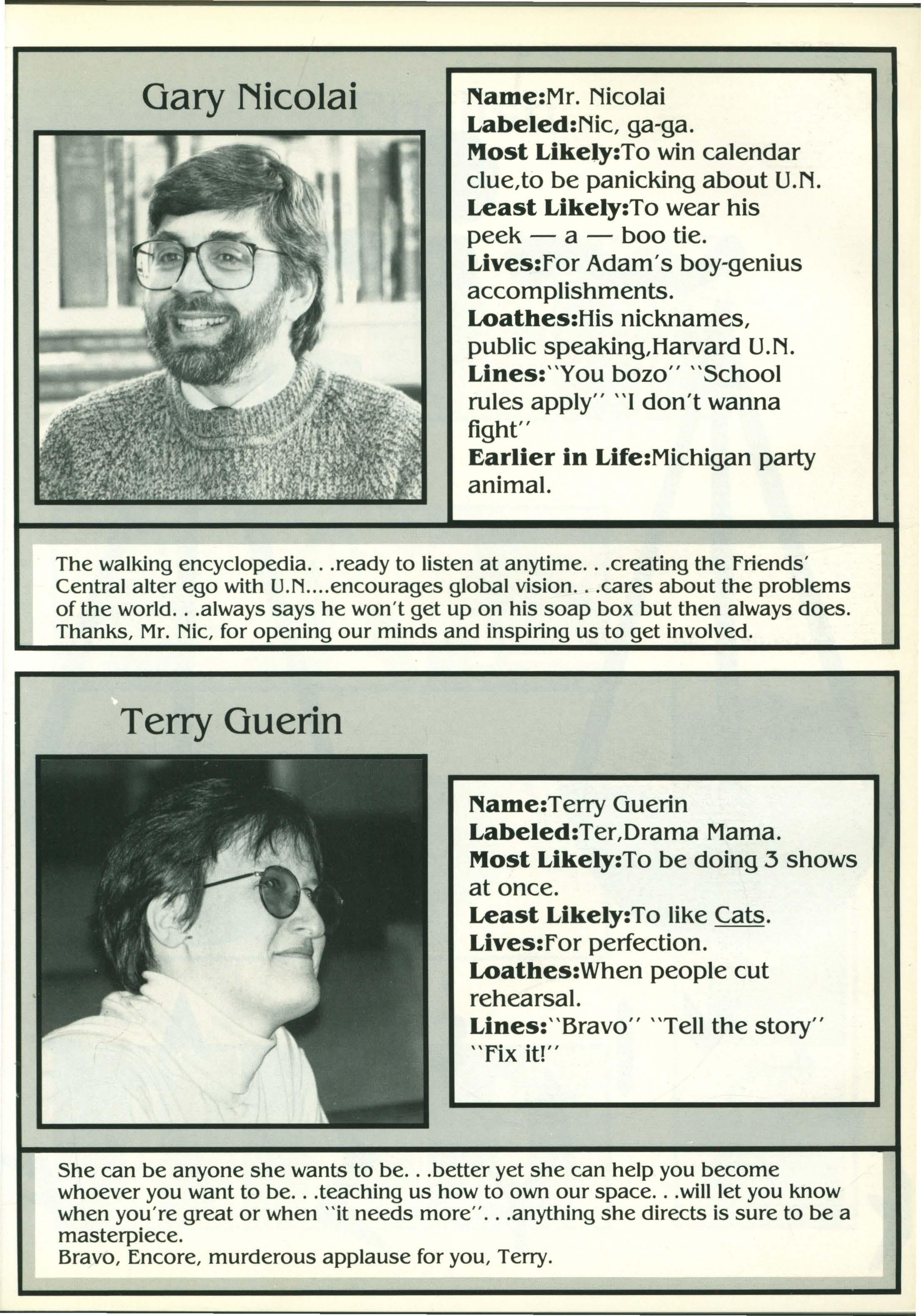 The walking encyclopedia ... ready to listen at anytime ... creating the Friends' Central alter ego with U.N . . .. encourages global vision . . .cares about the problems of the world always says he won't get up on his soap box but then always does. Thanks, Mr. Nic, for opening our minds and inspiring us to get involved.