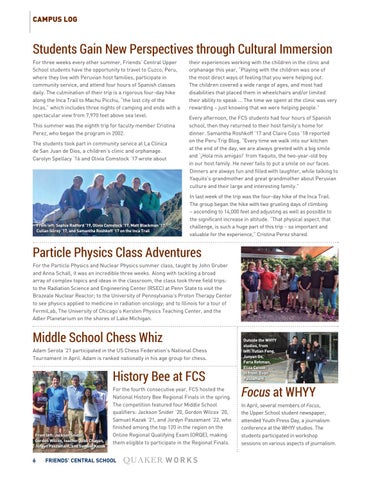 Students Gain New Perspectives through Cultural Immersion For three weeks every other summer, Friends’ Central Upper School students have the opportunity to travel to Cuzco, Peru, where they live with Peruvian host families, participate in community service, and attend four hours of Spanish classes daily. The culmination of their trip is a rigorous four-day hike along the Inca Trail to Machu Picchu, “the lost city of the Incas,” which includes three nights of camping and ends with a spectacular view from 7,970 feet above sea level. This summer was the eighth trip for faculty member Cristina Perez, who began the program in 2002. The students took part in community service at La Clinica de San Juan de Dios, a children’s clinic and orphanage. Carolyn Spellacy ’16 and Olivia Comstock ’17 wrote about