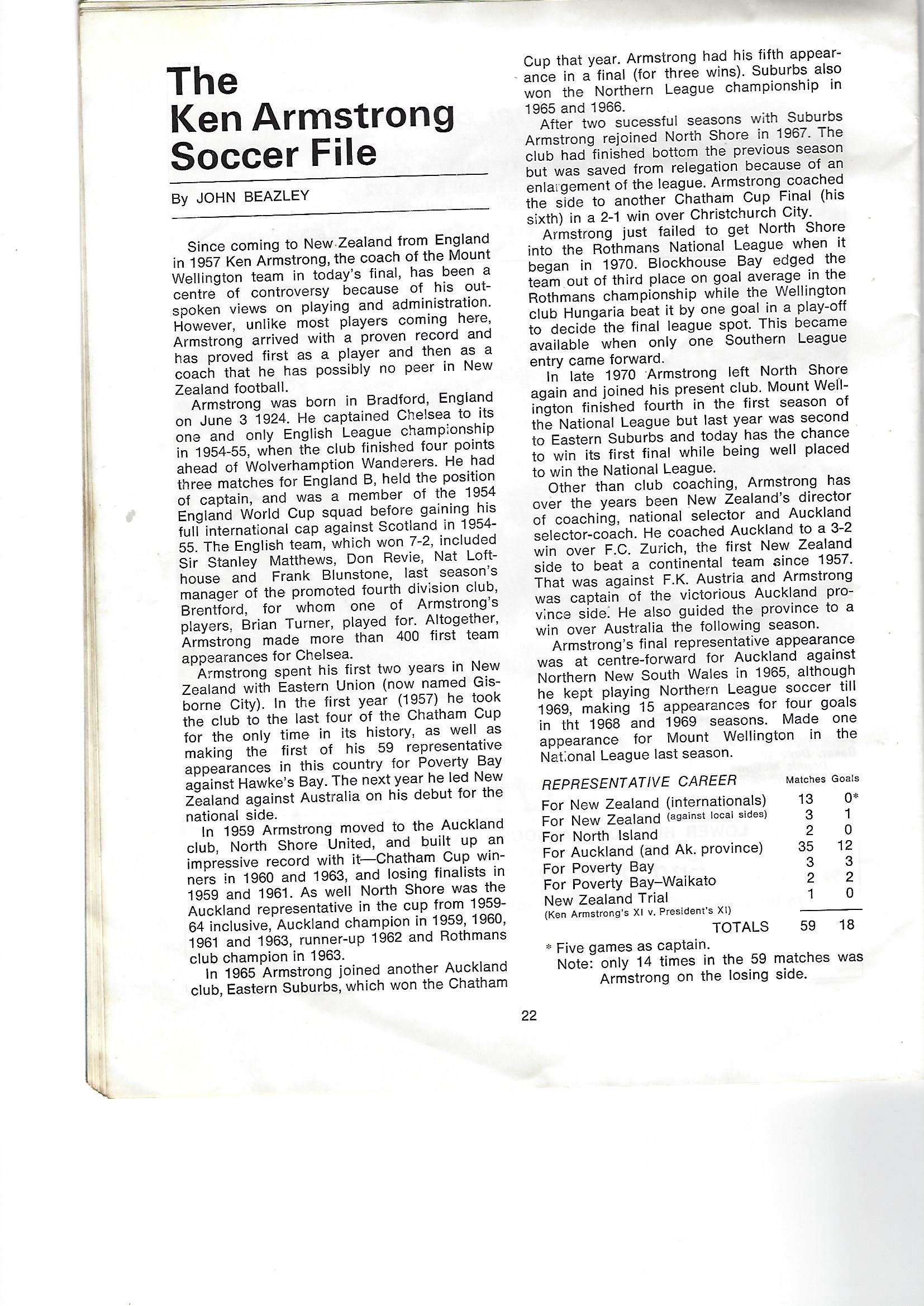 This was the match programme for what was one of the most lauded Chatham Cup finals of all time. The teams drew their 1972 Chatham Cup Final 4-4 at the Basin Reserve, Wellington. A week later, they battled out a 1-1 draw in the replay at English Park, Christchurch. The third attempt to separate these fierce rivals was staged at Auckland's Newmarket Park where Christchurch United won 2-1. More information about Friends of Football: www.friendsoffootballnz.com.