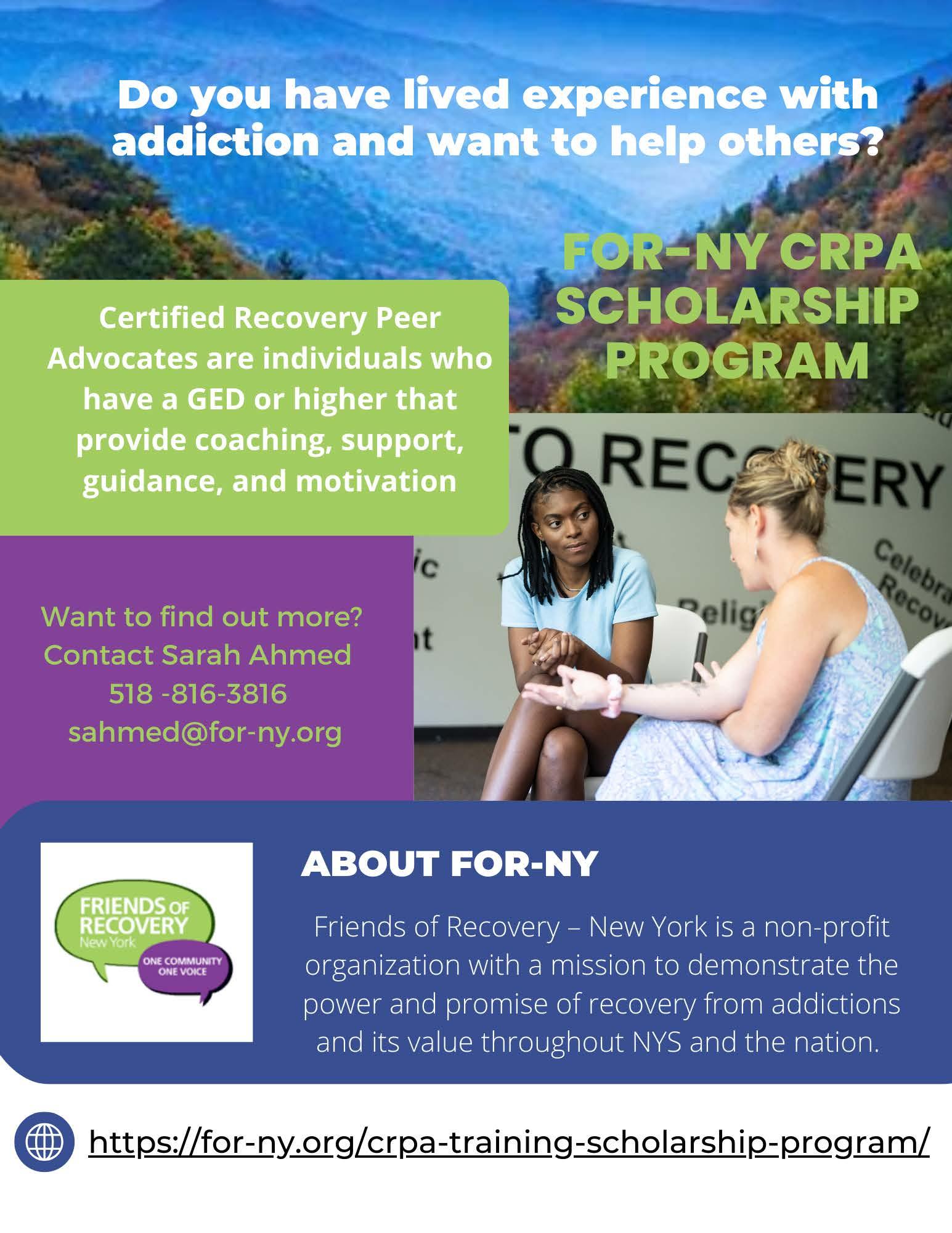 Scholarships: - funds are here! 25 scholarships are available now. CRPA scholarship application/info: http://app.donorview.com/r3n0M NYS Recovery Conference 2024 - October DATE and PLACE (Albany) TBD –Program