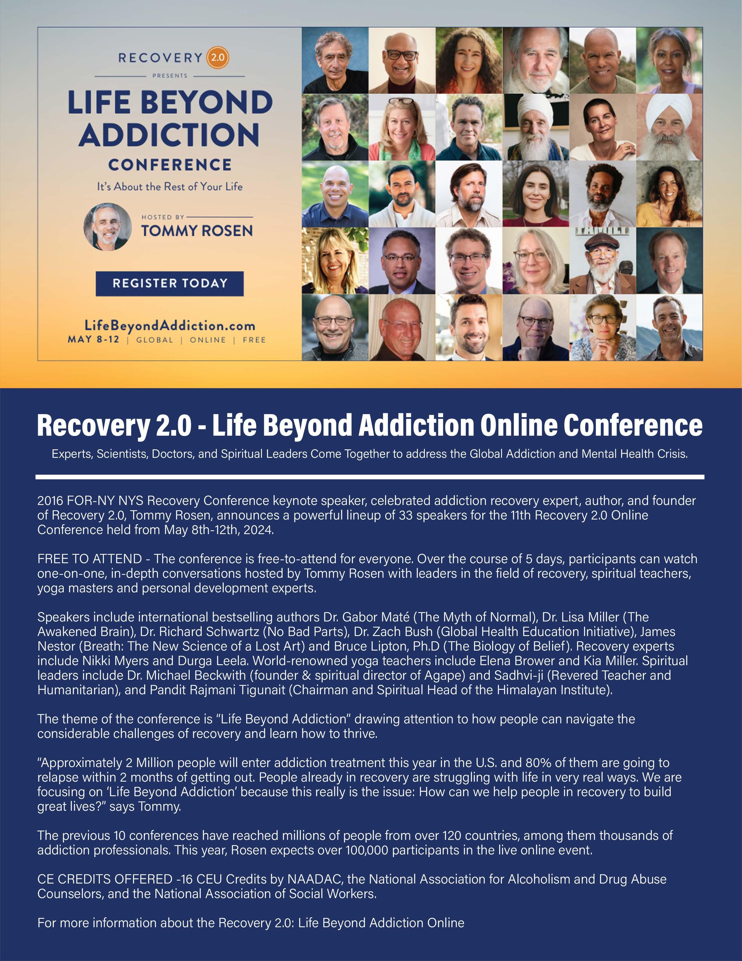 2016 FOR-NY NYS Recovery Conference keynote speaker, celebrated addiction recovery expert, author, and founder of Recovery 2.0, Tommy Rosen, announces a powerful lineup of 33 speakers for the 11th Recovery 2.0 Online Conference held from May 8th-12th, 2024.