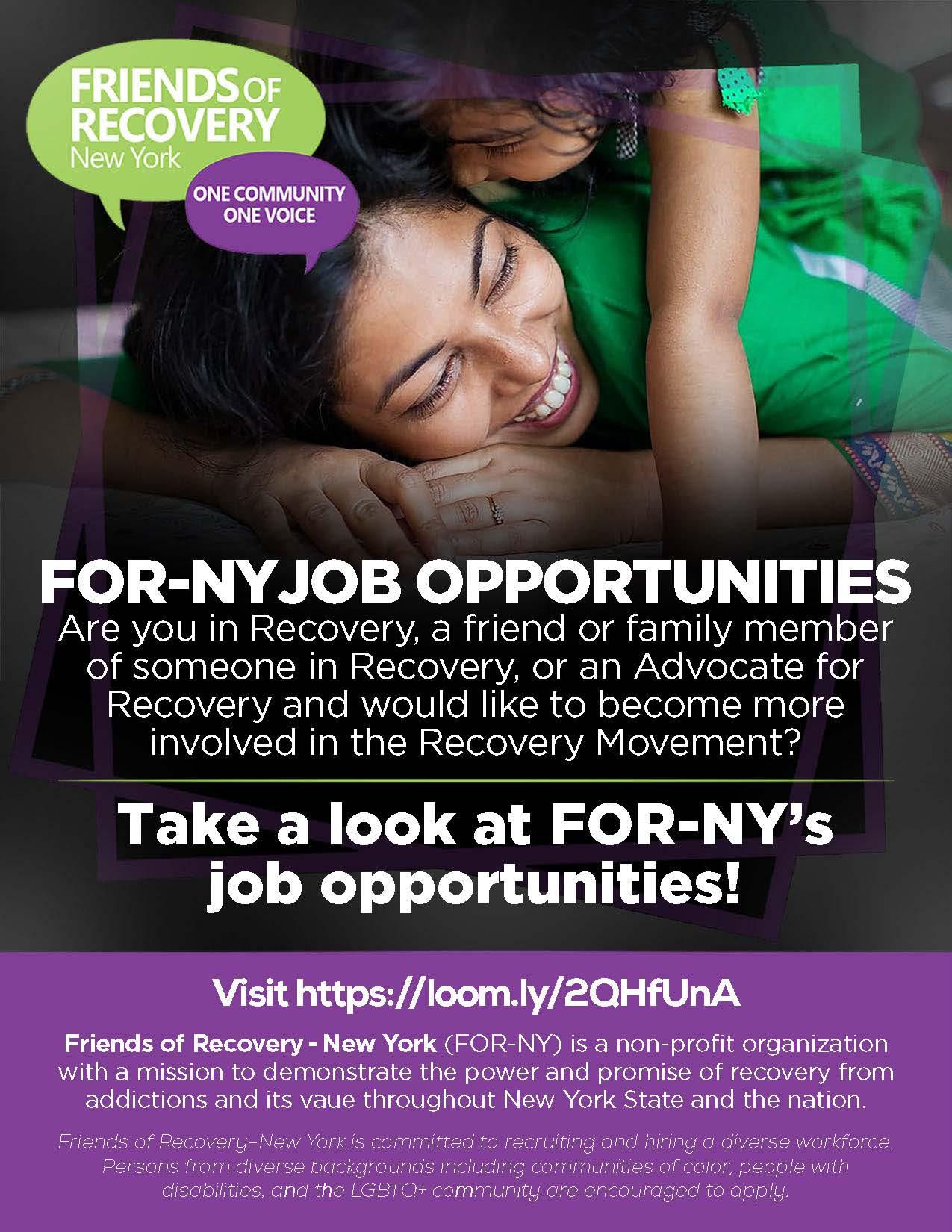 Friends of Recovery - New York (FOR-NY) is a statewide Recove7 Community Organization (RCO) dedicated to advocating with and on behalf of millions o individuals and fami l ies impacted by addiction and recovery across New York State. Together, we work to educate decision makers and the general public on the power and promise of recovery.