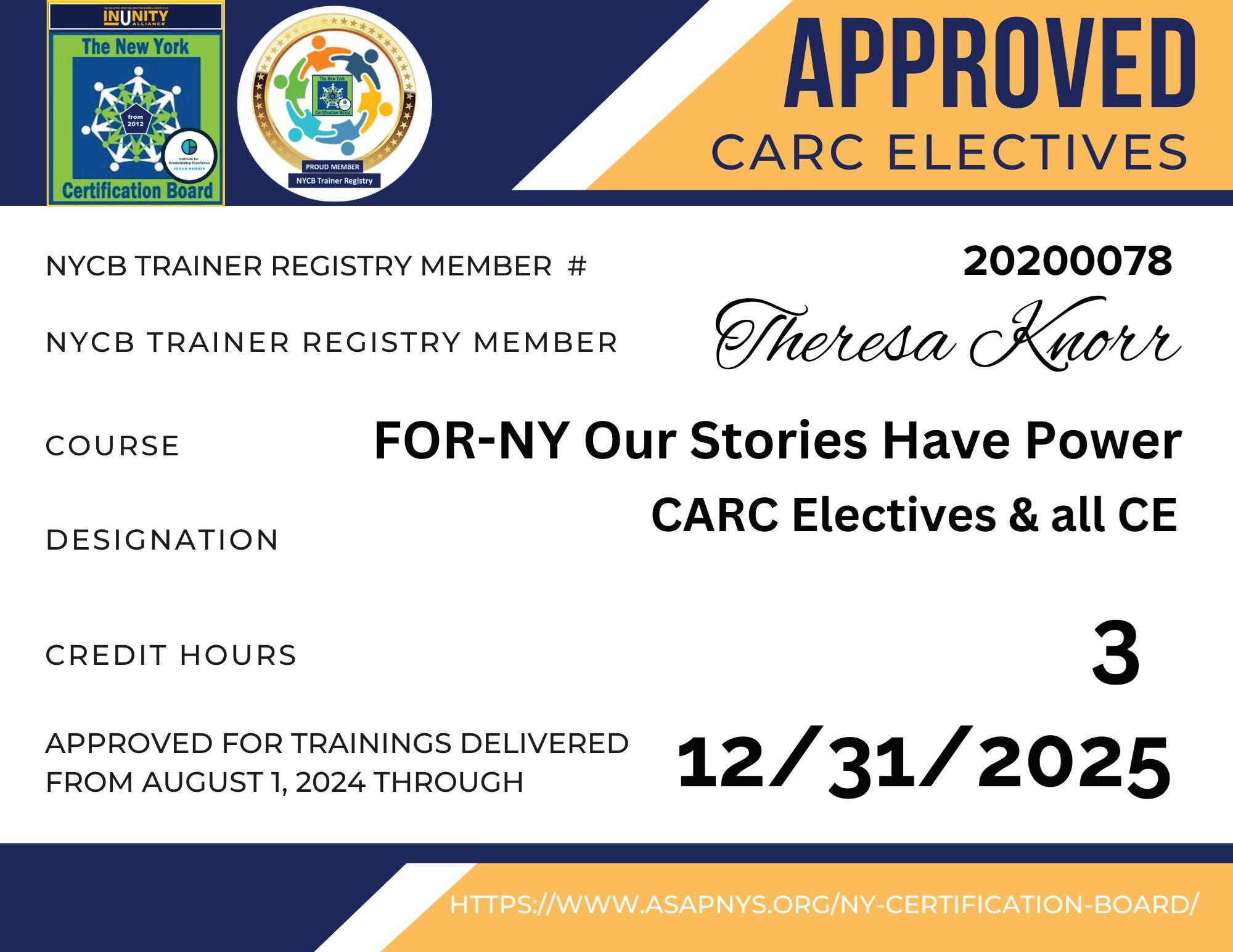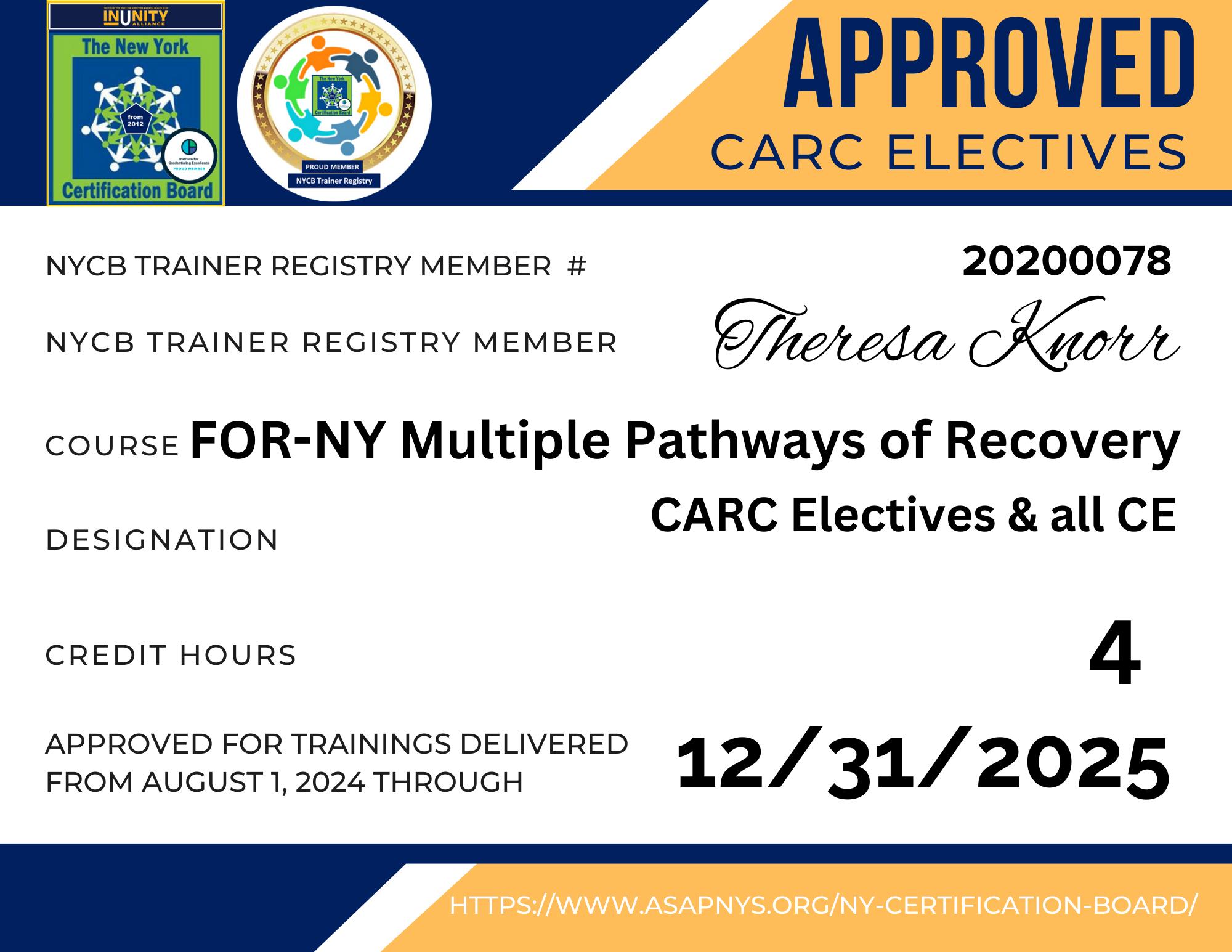 Professional Development Credits (PENDING) – 3.75 CARC/CRPA recertification credits – New York Certification Board (NYCB) trainer registry member. No partial credit, full attendance required.