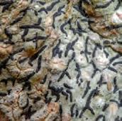These crustose lichens are found on trees. The apothecia (fruiting bodies) are elongated like mysterious writing.