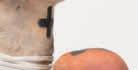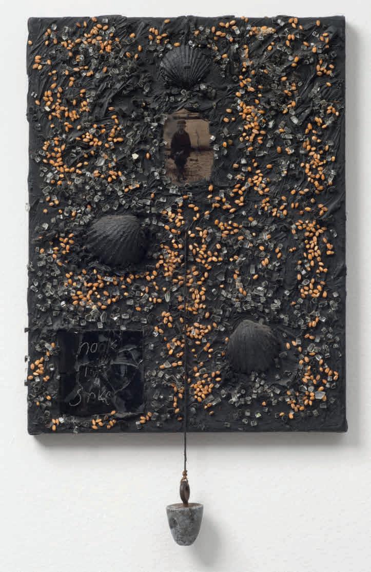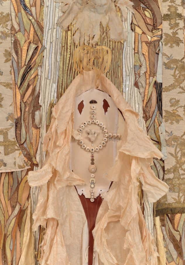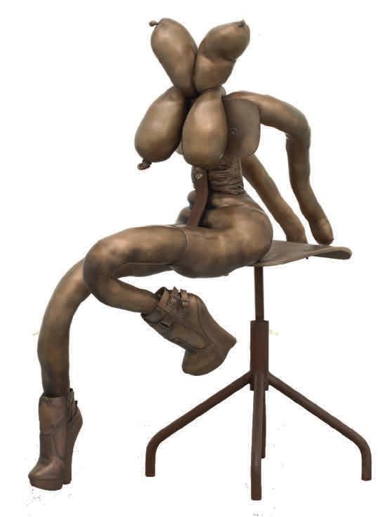 mops whose ends slither into tongues (Floor Licker, 2013). Her broom, now transformed into a scythe with a seat (Untitled, 2025), hangs on the wall, waiting for the next ride, ready to sever heads and limbs. Nearby, the decapitated head of Ursuţa’s lover lies in wait to be consumed (Untitled, 2025), beside other bodily remnants: a pair of skeletal legs perched in an awkward squat (Pudendal Monstrance, 2025); a headless, armless female torso adorned with ornate coin necklaces (Conversion Table, 2014). These cast bronze sculptures are stored on shelves inside cages once used to restrain animals before slaughter.
