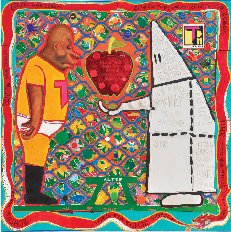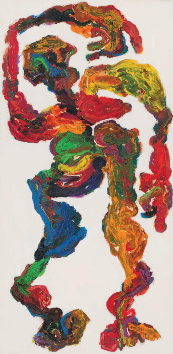 The figures are tragicomic, trapped in a form of self-inflicted absurdity. Their bodies are strangely lumpen; their heads and arms have atrophied. The colourful sculpture’s blend of sickly browns, dirty yellows and fleshy pinks evokes putrefaction, reinforcing this sense of degeneration. Here, morbidity is not merely thematic – it is structural, embedded in the very texture of the work.