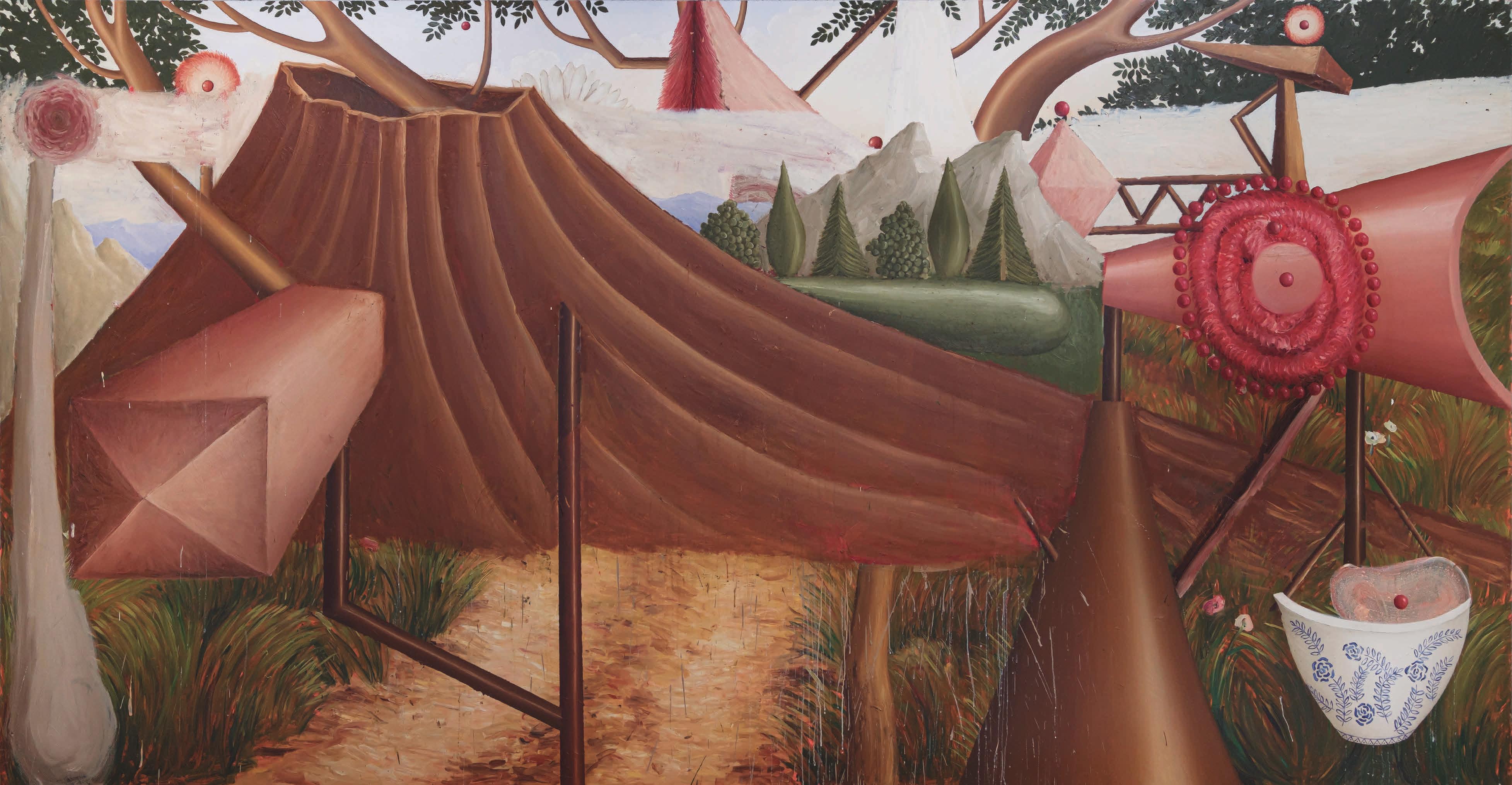The film is presented within a papier-mâché cave evoking a molehill. Outside this structure, mounds of soil on the floor and bits of mosaic and mirror set the stage for a pastel-toned, fantastical environment – somewhere between funhouse and prop room. The oil painting series ‘Space Off’ (2025) picks up the film’s themes. Hung across three walls, each work depicts one or more of the augural birds. The owl and chicken appear as stand-alone portraits – the latter with a backwards scroll reading ‘I’m always lying’ – while the other five