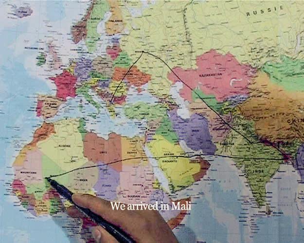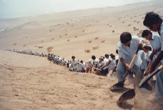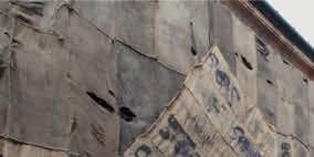 One crucial component also sharpens the show’s political bite. One of the plywood hoardings is covered with pencil