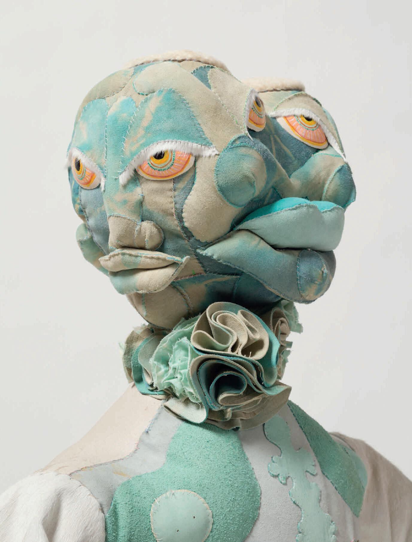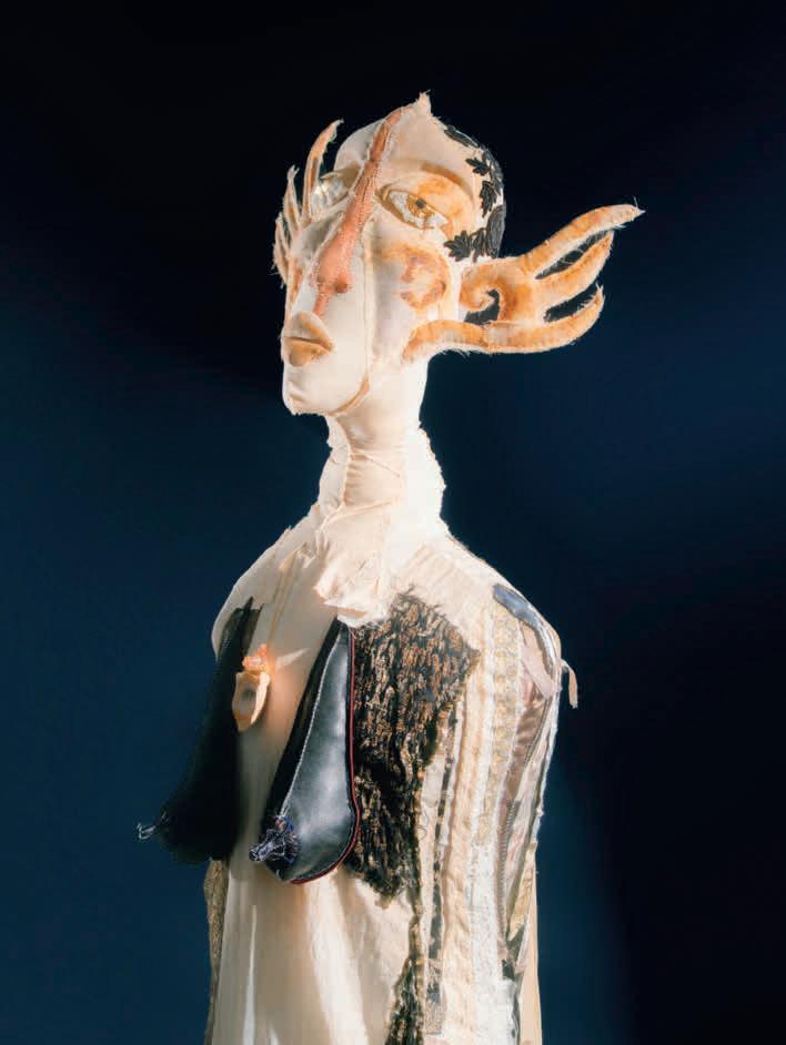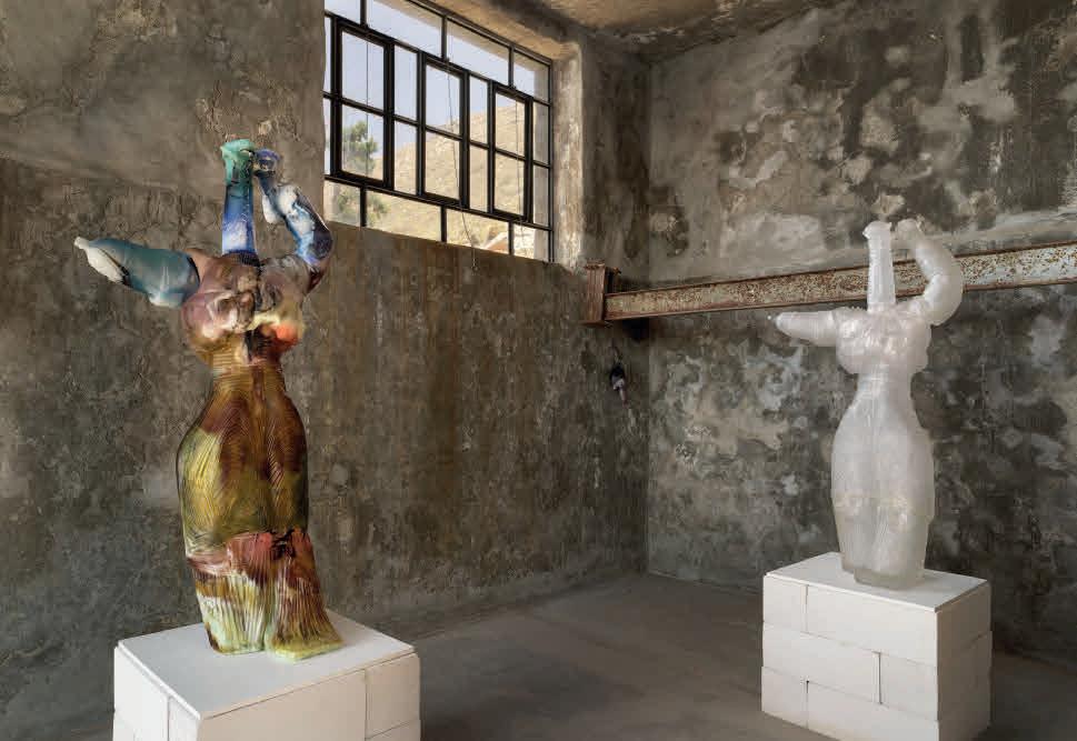 Half-Drunk Mummy (2019/24): two sculptures of female figures rendered in lead crystal, one transparent, the other tinted with lustrous colours. Their contrast recalls the historical misreading of classical sculpture as having been purely white. That whiteness, now embedded within the conception of classical beauty, is in fact the result of the coloured paint having weathered over the centuries, as well as aggressive, insensitive restoration. Ursuţa’s bottle-shaped glass women, their form derived from an assemblage of found objects, could in theory dispense alcohol; stains of the liquid still mark their insides. The artist describes them to me as ‘halfdrunk, half-empty, half-foolish’. They invite varied interpretations: whether caught in