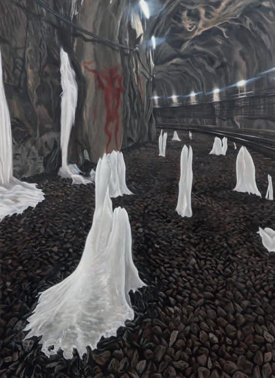 form a pentaptych set against a surreal background of misty hills, arched windows and castle-like stone steps in delicate brushstrokes and a soft palette. Bycroft’s cutesy ‘Minuscules’ (2025) – ceramic and mixed-media heads – playfully reimagine polychrome Graeco-Roman statuary, with jewellery, seed containers and branches for birds to perch on. ‘Monstrum’ (2025), meanwhile, is a colourful series of eight larger, mixed-media sculptures evoking human, bird and mineral hybrid forms in various states of transformation.  Bycroft’s busy exhibition is full of diversions, playing with hierarchies of taste, technique, double meaning and cultural value. Elaborate oil paintings appear alongside papier-mâché; awkward mise-en-scène undercuts polished production; allegory rubs up against absurdity. These tensions between high and marginal cultures feed the polyphonic texture of the show. ‘The Lies of the Weatherman’ draws a pointed link between institutional deceit and the quieter concealments born of survival, suggesting that not all lies are acts of power: some are protective strategies for enduring illegibility.