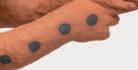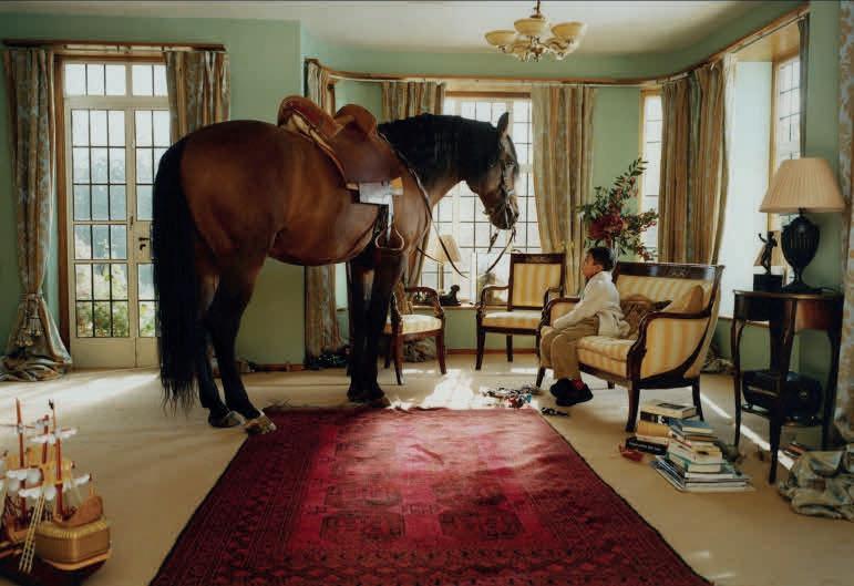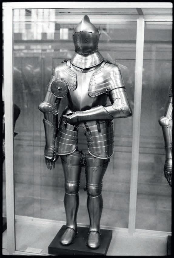decoration extends to the print’s surface, which blackens along the plate edge, exposing the emulsion and its development. No mat, no frame, no label, no ornament. Such austerity is the formal antithesis to her subject matter: the armour with its sumptuous detail and self-conscious defensiveness, those glaring rondels. There’s a contradiction inherent to the series, for each image displays simultaneously a war trophy – polished steel with cocked arms at attention – and weakness, the thick armour obscuring the now absent figure, his necessarily fragile human body. We look through the vacant spaces where their codpieces should be, crotchless and desexed: a rhyme back, possibly, to Leonard’s installation at documenta IX (1992), where the artist placed black and white shots of vulvas amid the Old Master paintings of Kassel’s Neue Galerie (a critique of another desexed sexuality). Here, however, such absences disclose the vulnerability of the wearer, a reminder that these suits of armour were never quite in the vanguard. Rather, they were merely the embellished reaction of an arrière-garde ill-suited to endure a sea change in modern warfare: the development of gunpowder technology in Europe. Plate armour was abandoned, in part, not because steel failed but because human beings faltered: the body’s frame was simply too frail to bear the hardened platework necessary for survival.